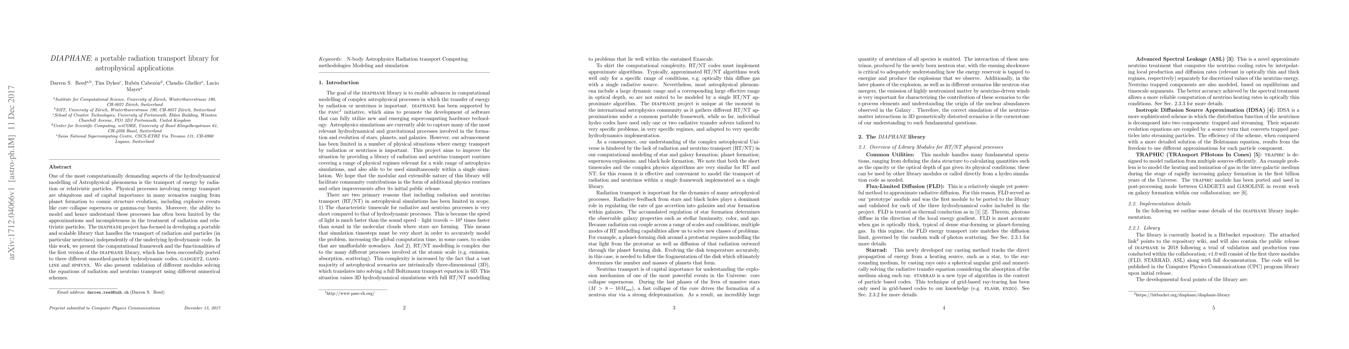 The DIAPHANE library is a portable and scalable tool for modeling radiation and relativistic particle transport in astrophysical phenomena, overcoming previous limitations in approximations. It has been integrated into three smoothed-particle hydrodynamic codes and validated through various numerical schemes for radiation and neutrino transport.