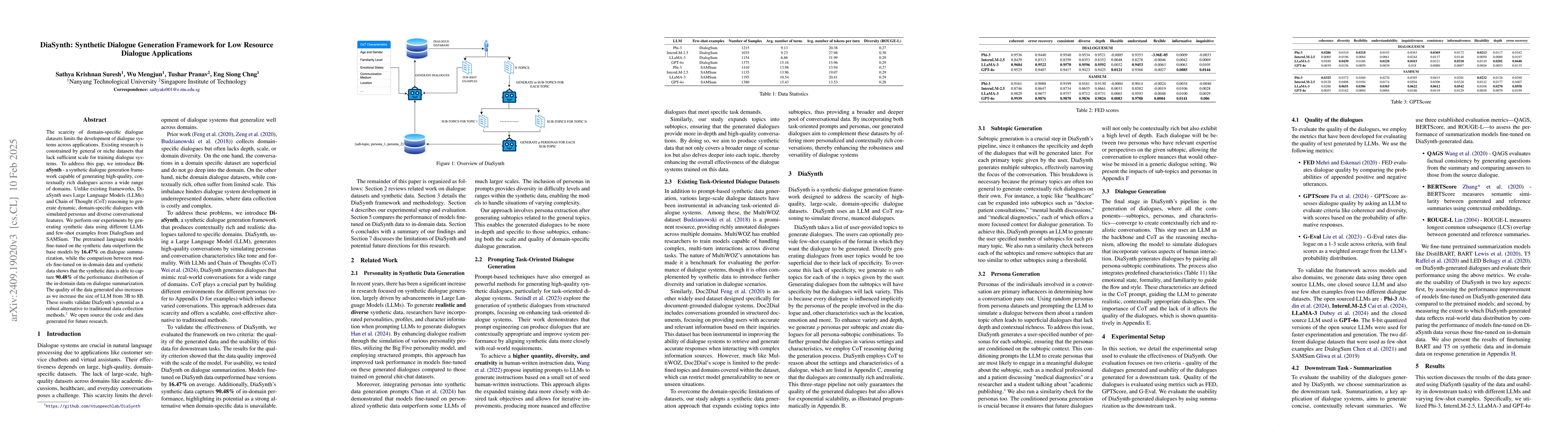 DiaSynth framework for synthetic dialogue generation using LLMs with CoT reasoning, demonstrating scalability and adaptability for diverse domains and dialogue formats.