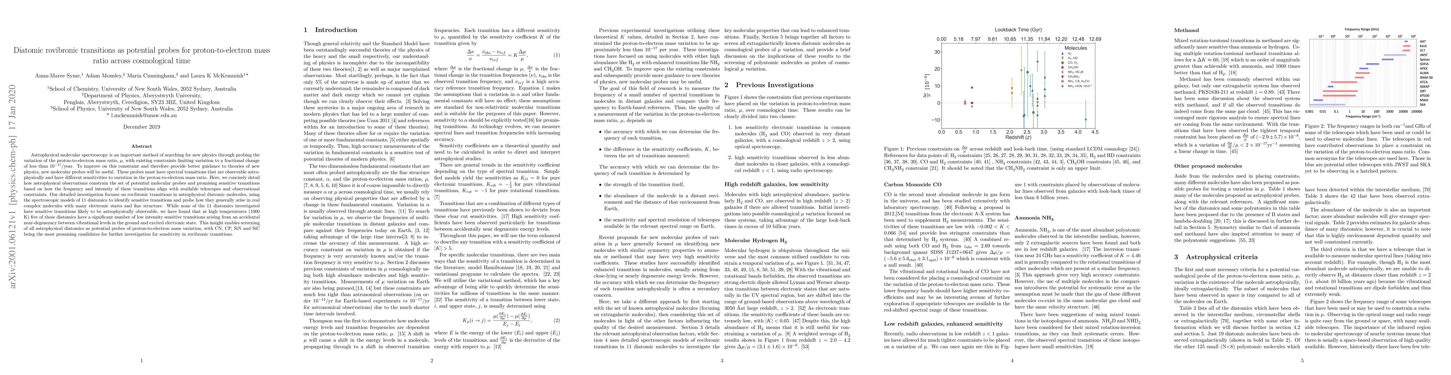 Astrophysical molecular spectroscopy is an important method of searching for new physics through probing the variation of the proton-to-electron mass ratio, $\mu$, with existing constraints limiting variation to a fractional change of less than 10$^{-17}$/year. To improve on this constraint and therefore provide better guidance to theories of new physics, new molecular probes will be useful. These probes must have spectral transitions that are observable astrophysically and have different sensitivities to variation in the proton-to-electron mass ratio. Here, we concisely detail how astrophysical observations constrain the set of potential molecular probes and promising sensitive transitions based on how the frequency and intensity of these transitions align with available telescopes and observational constraints. Our detailed investigation focuses on rovibronic transitions in astrophysical diatomic molecules, using the spectroscopic models of 11 diatomics to identify sensitive transitions and probe how they generally arise in real complex molecules with many electronic states and fine structure. While none of the 11 diatomics investigated have sensitive transitions likely to be astrophysically observable, we have found that at high temperatures (1000 K) five of these diatomics have a significant number of low intensity sensitive transitions arising from an accidental near-degeneracy between vibrational levels in the ground and excited electronic state. This insight enables screening of all astrophysical diatomics as potential probes of proton-to-electron mass variation, with CN, CP, SiN and SiC being the most promising candidates for further investigation for sensitivity in rovibronic transitions.