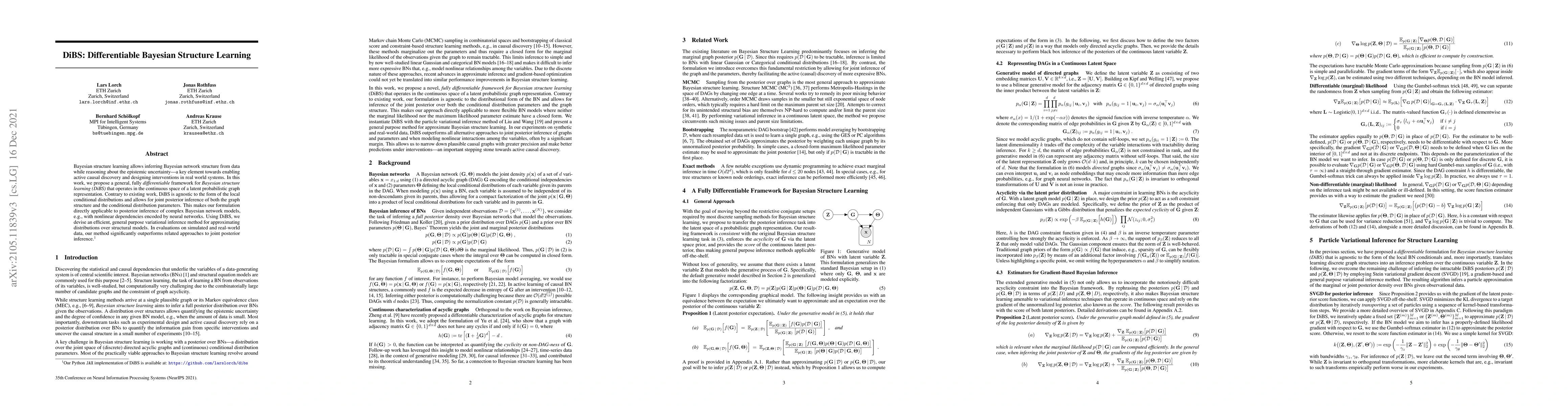 DiBS is a differentiable framework for Bayesian structure learning that infers network structure and conditional distribution parameters jointly. This method outperforms existing approaches in approximating distributions over structural models, enabling effective causal discovery and intervention design.