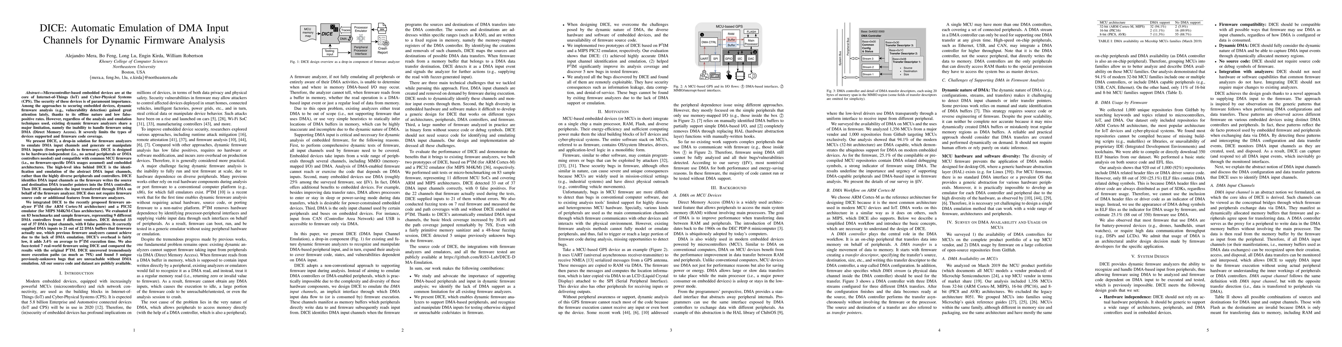 DICE is a novel solution to emulate DMA input channels for dynamic firmware analysis, addressing the limitation of existing analyzers in handling DMA. It successfully detected and manipulated DMA inputs, uncovering more execution paths and bugs in real-world firmware compared to traditional methods.