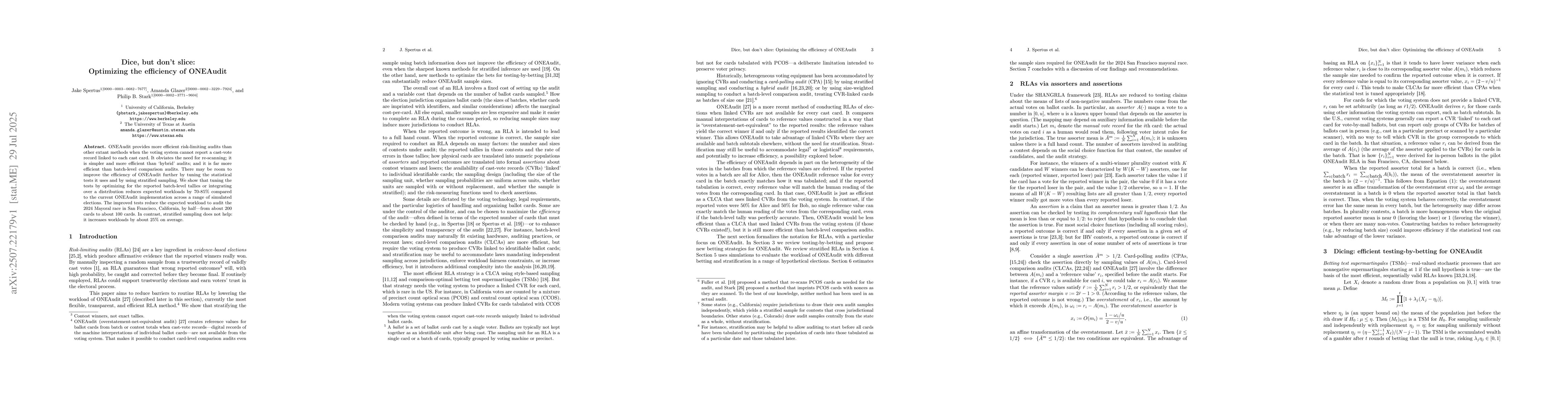 ONEAudit provides more efficient risk-limiting audits than other extant methods when the voting system cannot report a cast-vote record linked to each cast card. It obviates the need for re-scanning; it is simpler and more efficient than 'hybrid' audits; and it is far more efficient than batch-level comparison audits. There may be room to improve the efficiency of ONEAudit further by tuning the statistical tests it uses and by using stratified sampling. We show that tuning the tests by optimizing for the reported batch-level tallies or integrating over a distribution reduces expected workloads by 70-85% compared to the current ONEAudit implementation across a range of simulated elections. The improved tests reduce the expected workload to audit the 2024 Mayoral race in San Francisco, California, by half -- from about 200 cards to about 100 cards. In contrast, stratified sampling does not help: it increases workloads by about 25% on average.