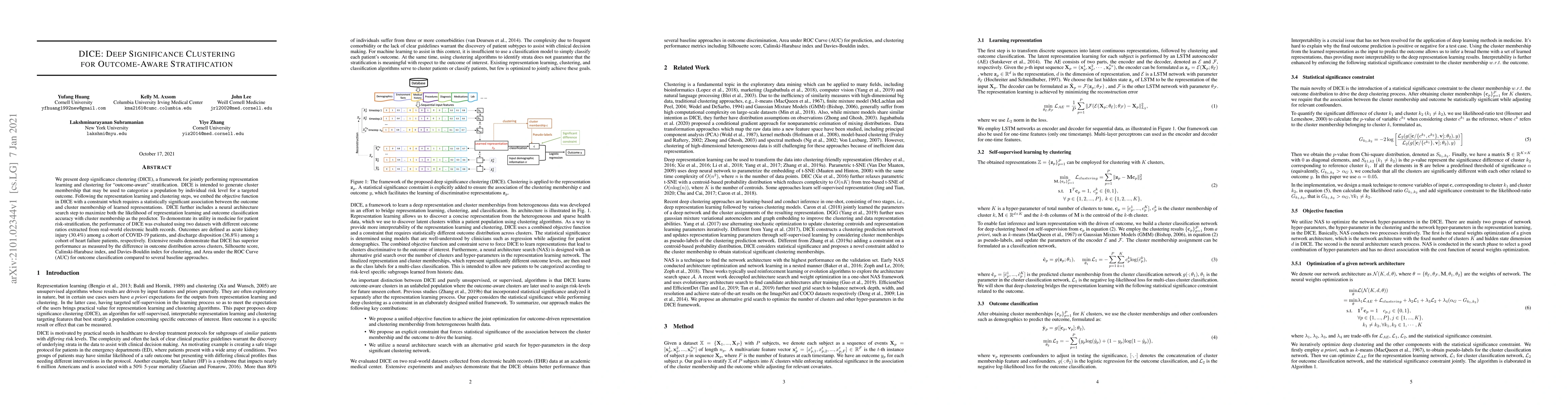 We present deep significance clustering (DICE), a framework for jointly performing representation learning and clustering for "outcome-aware" stratification. DICE is intended to generate cluster membership that may be used to categorize a population by individual risk level for a targeted outcome. Following the representation learning and clustering steps, we embed the objective function in DICE with a constraint which requires a statistically significant association between the outcome and cluster membership of learned representations. DICE further includes a neural architecture search step to maximize both the likelihood of representation learning and outcome classification accuracy with cluster membership as the predictor. To demonstrate its utility in medicine for patient risk-stratification, the performance of DICE was evaluated using two datasets with different outcome ratios extracted from real-world electronic health records. Outcomes are defined as acute kidney injury (30.4\%) among a cohort of COVID-19 patients, and discharge disposition (36.8\%) among a cohort of heart failure patients, respectively. Extensive results demonstrate that DICE has superior performance as measured by the difference in outcome distribution across clusters, Silhouette score, Calinski-Harabasz index, and Davies-Bouldin index for clustering, and Area under the ROC Curve (AUC) for outcome classification compared to several baseline approaches.