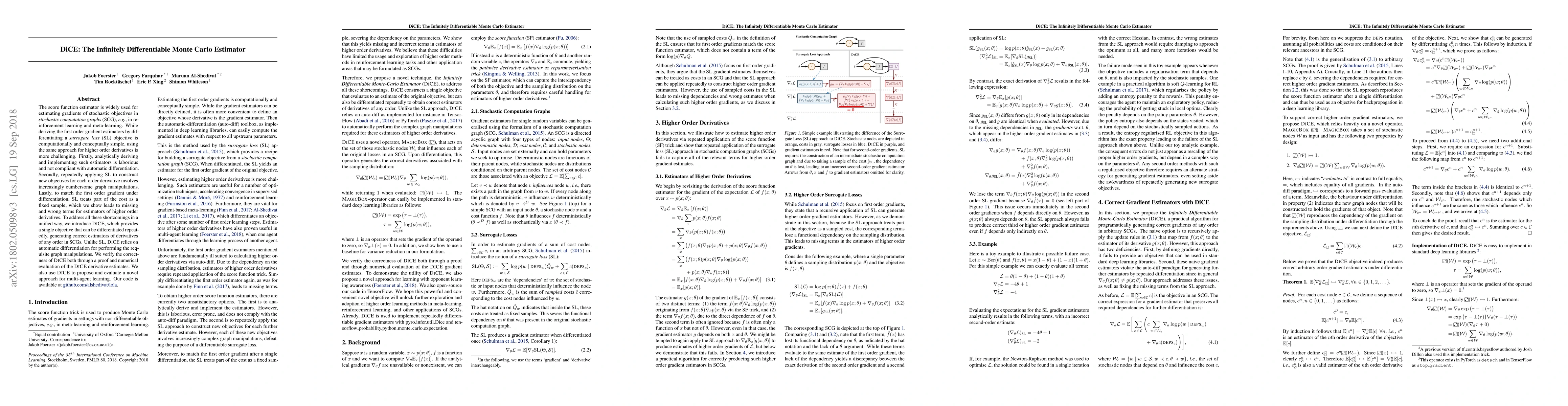 The paper introduces DiCE, a method for estimating gradients of any order in stochastic computation graphs, addressing limitations of the score function estimator. DiCE leverages automatic differentiation, ensuring correctness through proofs and numerical evaluation, and is applied to propose a novel multi-agent learning approach.