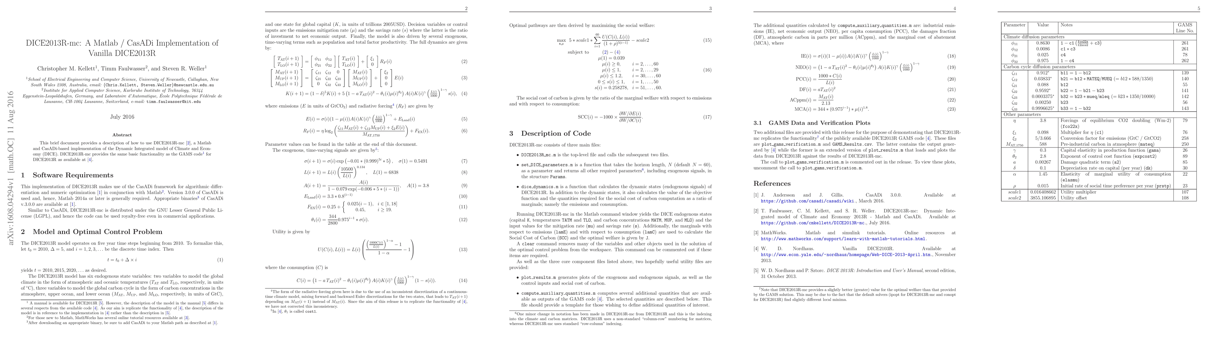 This brief document provides a description of how to use DICE2013R-mc \cite{DICE2013R-mc}, a Matlab and CasADi-based implementation of the Dynamic Integrated model of Climate and Economy (DICE). DICE2013R-mc provides the same basic functionality as the GAMS code (A manual is available for DICE2013R DICEManual). However, the description of the model in the manual (DICEManual) differs in several respects from the available code (DICECode). As our aim is replicate the functionality of (DICECode}, the description of the model is in reference to the implementation in (DICECode) rather than the description in (DICEManual). for DICE2013R as available at (DICECode).