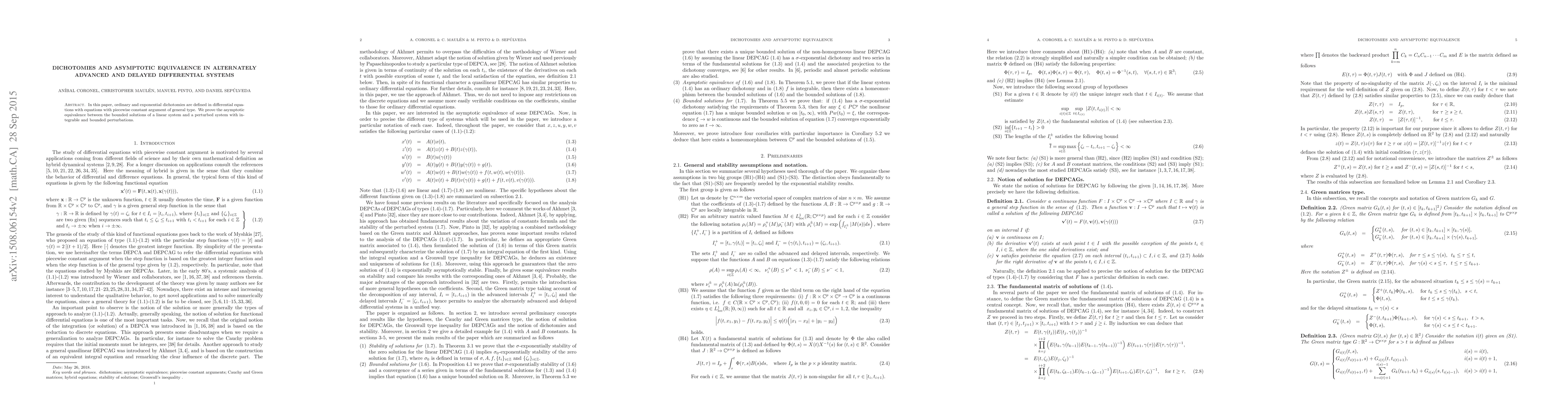 This paper defines ordinary and exponential dichotomies for differential equations with piecewise constant arguments. It proves the asymptotic equivalence between bounded solutions of a linear system and a perturbed system with integrable and bounded perturbations.