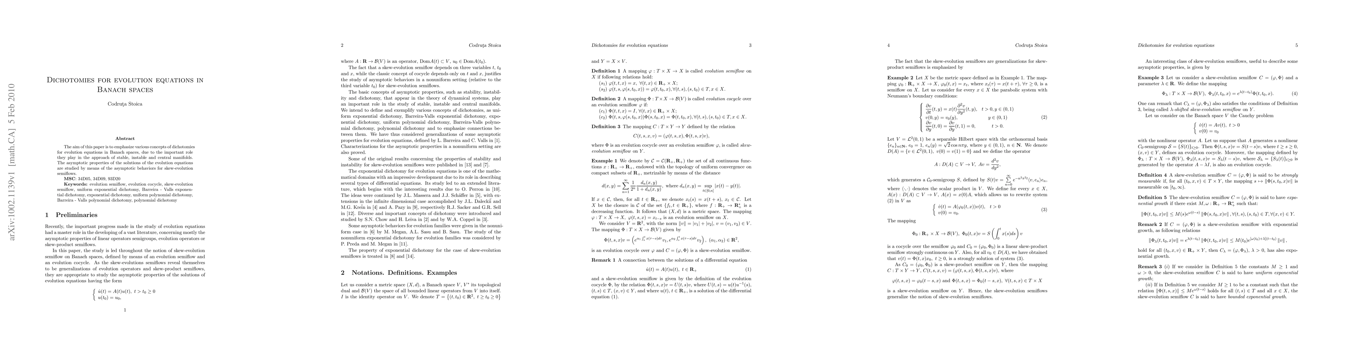 This paper explores different types of dichotomies for evolution equations in Banach spaces, highlighting their significance in understanding stable, unstable, and central manifolds. It investigates the asymptotic properties of solutions through the analysis of skew-evolution semiflows.