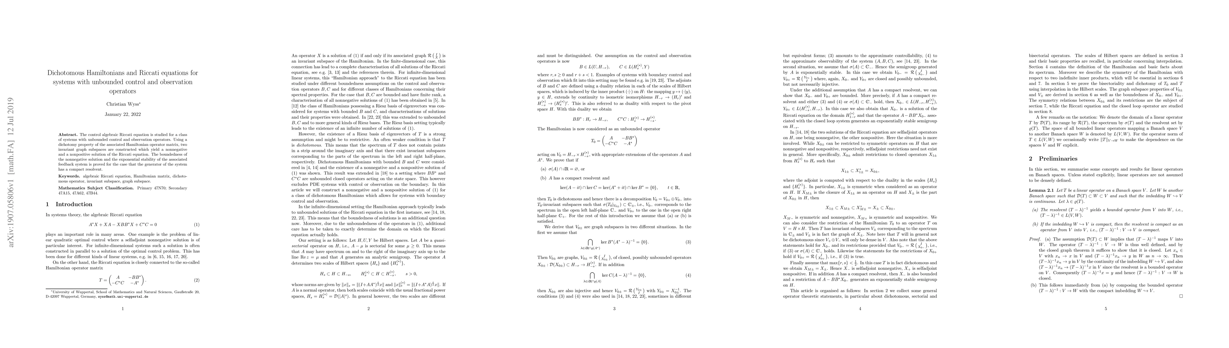 The control algebraic Riccati equation is studied for a class of systems with unbounded control and observation operators. Using a dichotomy property of the associated Hamiltonian operator matrix, two invariant graph subspaces are constructed which yield a nonnegative and a nonpositive solution of the Riccati equation. The boundedness of the nonnegative solution and the exponential stability of the associated feedback system is proved for the case that the generator of the system has a compact resolvent.