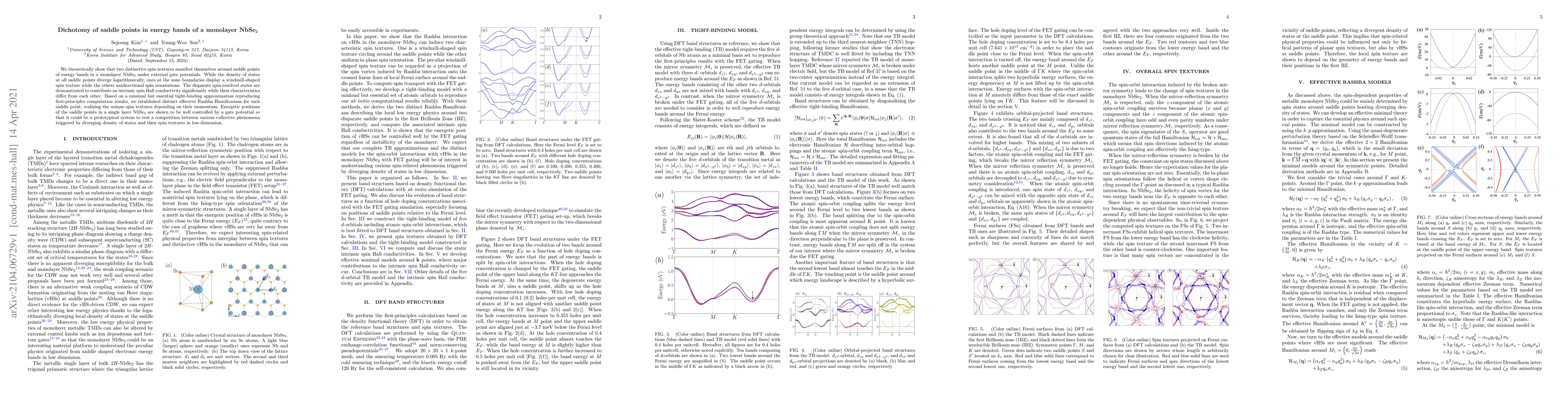 We theoretically show that two distinctive spin textures manifest themselves around saddle points of energy bands in a monolayer NbSe$_2$ under external gate potentials. While the density of states at all saddle points diverge logarithmically, ones at the zone boundaries display a windmill-shaped spin texture while the others unidirectional spin orientations. The disparate spin-resolved states are demonstrated to contribute an intrinsic spin Hall conductivity significantly while their characteristics differ from each other.Based on a minimal but essential tight-binding approximation reproducing first-principles computation results, we established distinct effective Rashba Hamiltonians for each saddle point, realizing the unique spin textures depending on their momentum. Energetic positions of the saddle points in a single layer NbSe$_2$ are shown to be well controlled by a gate potential so that it could be a prototypical system to test a competition between various collective phenomena triggered by diverging density of states and their spin textures in low-dimension.