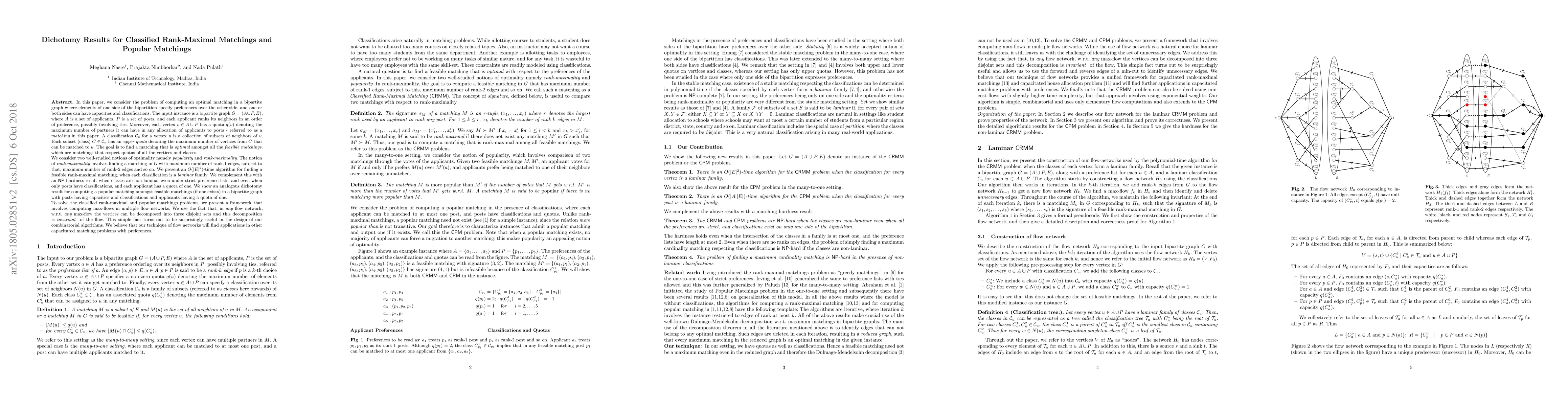 The paper explores the dichotomy results for two matching problems in bipartite graphs with capacities and classifications: rank-maximal matchings and popular matchings. It presents an O(|E|^2)-time algorithm for finding a feasible rank-maximal matching under certain conditions, but complements it with NP-hardness results for non-laminar classes and other scenarios.