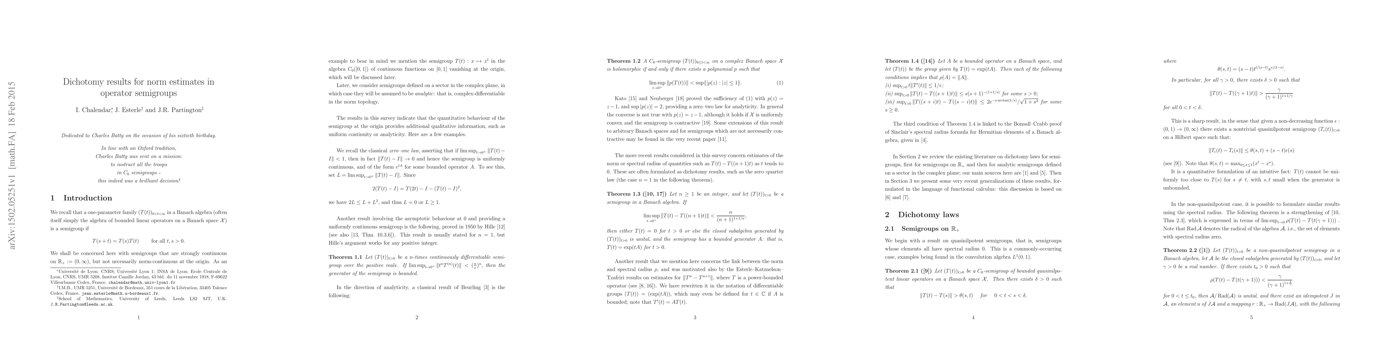 This is a survey paper concerned with strongly continuous semigroups in a Banach algebra (often itself simply the algebra of bounded linear operators on a Banach space). These are defined either on $(0,\infty)$ or on a sector in the complex plane, in which case they are supposed analytic. However, the semigroups are not assumed to be strongly continuous at 0. The results in this survey, beginning with classical theorems of Beurling, Kato and Neuberger and concluding with recent work by the authors, are of the nature of "0-1" laws, indicating that the quantitative behaviour of the semigroup at the origin provides additional qualitative information, such as uniform continuity or analyticity.