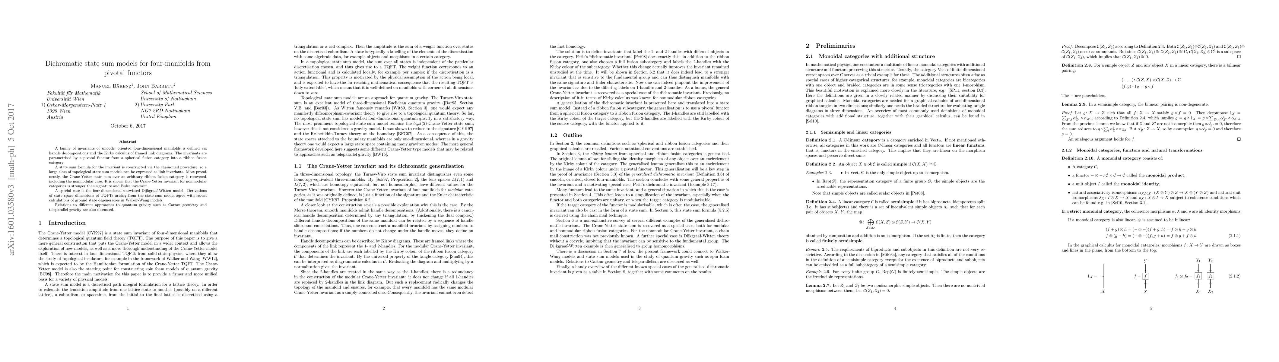 This paper defines invariants for four-manifolds using pivotal functors and state sum models, recovering the Crane-Yetter invariant, which is shown to be stronger than signature and Euler invariants. It also connects these models to quantum gravity approaches and agrees with recent calculations of ground state degeneracies.