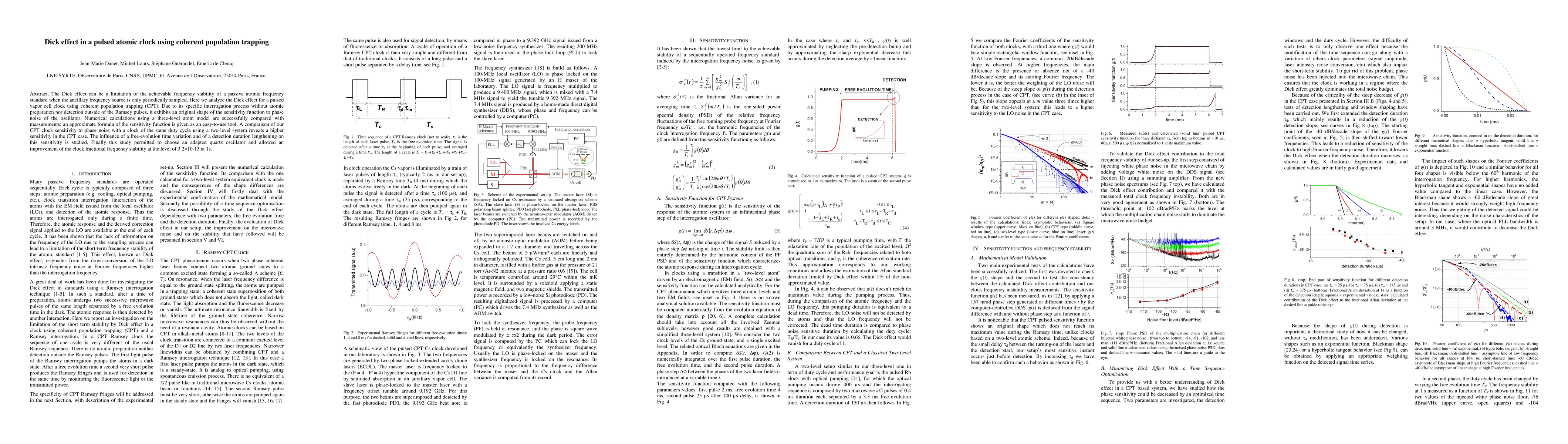 This study analyzes the Dick effect in a pulsed atomic clock using coherent population trapping (CPT), revealing a unique sensitivity function to phase noise. Numerical calculations match experimental results and show higher sensitivity in CPT compared to two-level systems, leading to a fractional frequency stability improvement of 3.2x10^-13 at 1 second.