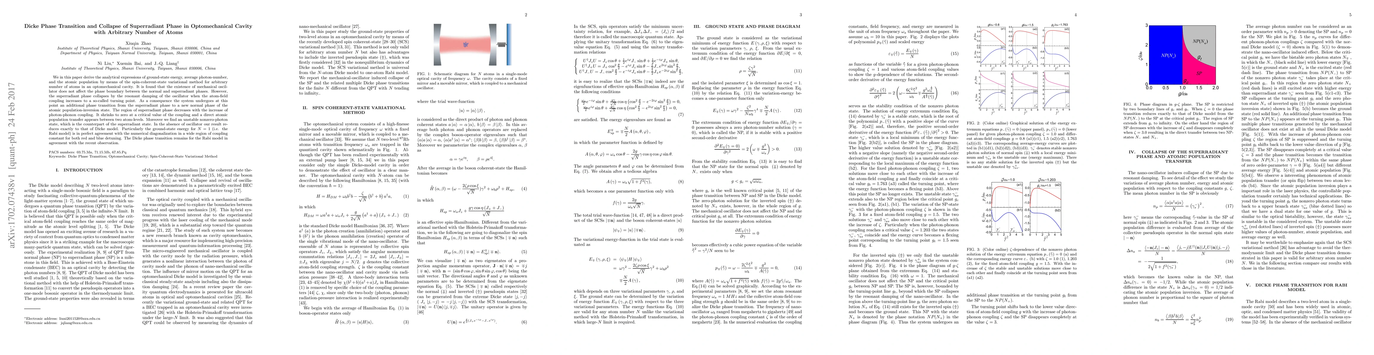 This paper derives analytical expressions for an optomechanical cavity with an arbitrary number of atoms, revealing that the mechanical oscillator does not alter the phase boundary between normal and superradiant phases. However, increased atom-field coupling leads to the collapse of the superradiant phase and an additional phase transition to a normal phase with atomic population inversion. The superradiant phase region diminishes with stronger photon-phonon coupling and vanishes at a critical coupling value, resulting in direct atomic population transfer.