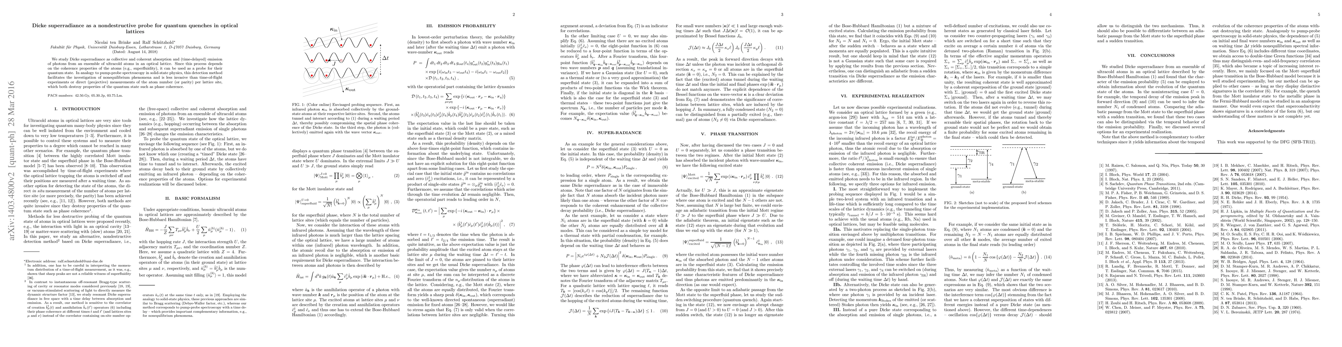 This paper investigates Dicke superradiance as a nondestructive method to probe quantum quenches in optical lattices, using collective photon absorption and emission from ultracold atoms to detect coherence properties like superfluidity without destroying the quantum state. This approach mimics pump-probe spectroscopy for studying nonequilibrium phenomena without the invasiveness of traditional measurement techniques.