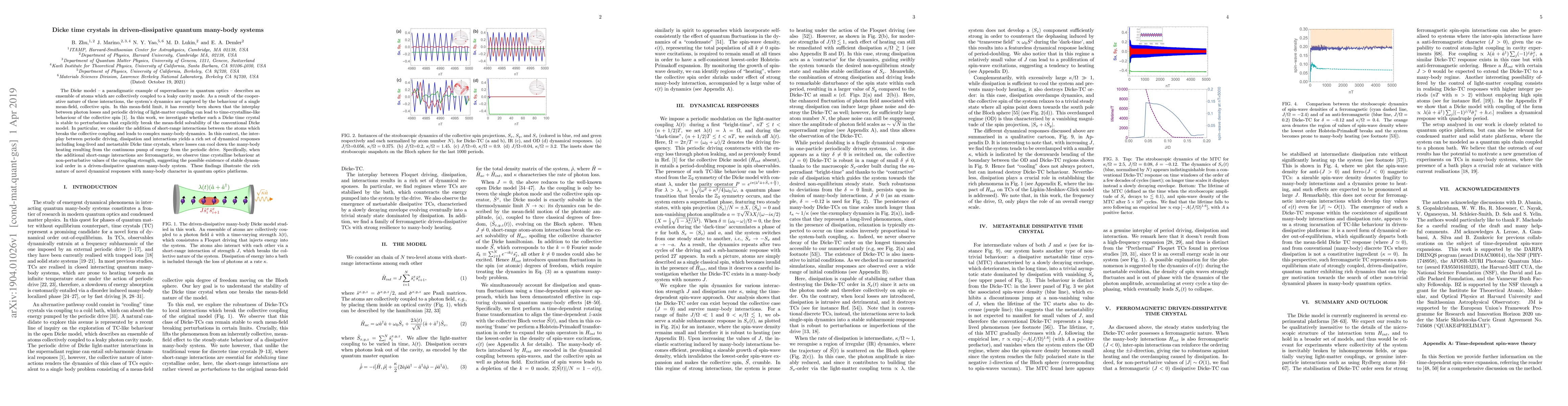 The Dicke model -- a paradigmatic example of superradiance in quantum optics -- describes an ensemble of atoms which are collectively coupled to a leaky cavity mode. As a result of the cooperative nature of these interactions, the system's dynamics are captured by the behavior of a single mean-field, collective spin. In this mean-field limit, it has recently been shown that the interplay between photon losses and periodic driving of light-matter coupling can lead to time-crystalline-like behavior of the collective spin. In this work, we investigate whether such a Dicke time crystal is stable to perturbations that explicitly break the mean-field solvability of the conventional Dicke model. In particular, we consider the addition of short-range interactions between atoms, which breaks the collective coupling and leads to complex many-body dynamics. In this context, the interplay between periodic driving, dissipation and interactions yields a rich set of dynamical responses including long-lived and metastable Dicke time crystals, where losses can cool down the many-body heating resulting from the continuous pump of energy from the periodic drive. Specifically, when the additional short-range interactions are ferromagnetic, we observe time crystalline behavior at non-perturbative values of the coupling strength, suggesting the possible existence of stable dynamical order in a driven-dissipative quantum many-body system. These findings illustrate the rich nature of novel dynamical responses with many-body character in quantum optics platforms.