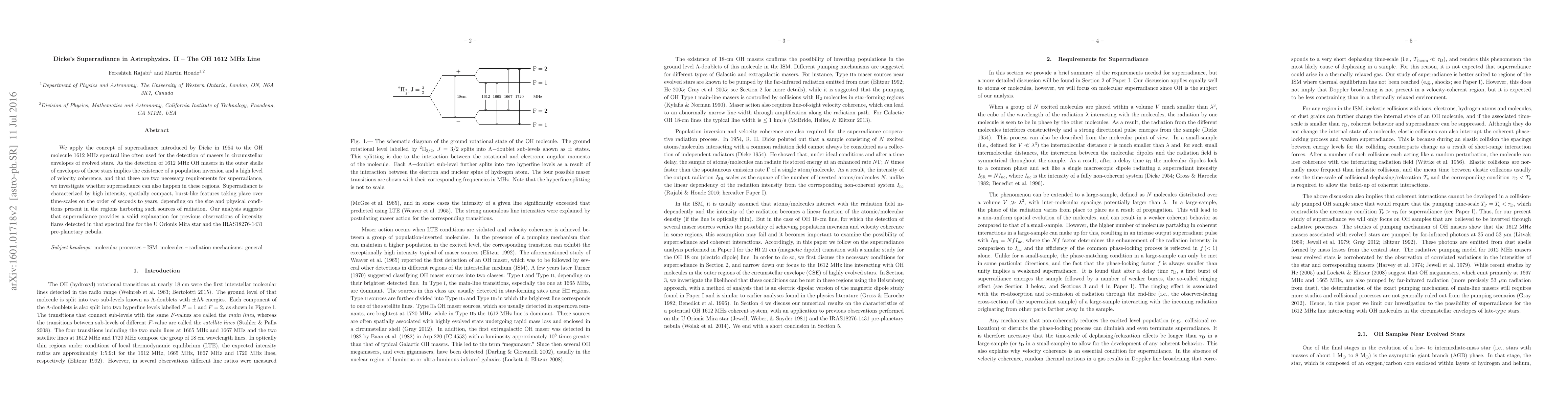 This paper applies Dicke's superradiance theory to the 1612 MHz OH molecule spectral line, often used for detecting masers in evolved stars' envelopes. The analysis suggests superradiance can explain intensity flares observed in U Orionis Mira star and IRAS18276-1431 pre-planetary nebula, characterized by high intensity, compact features, and time-scales from seconds to years.