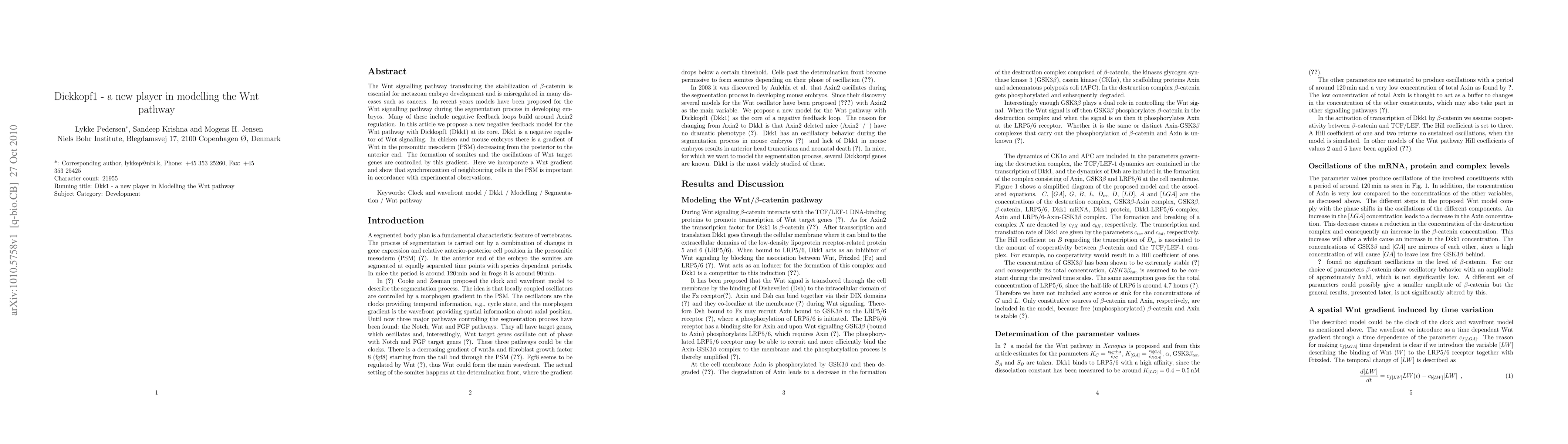 This paper proposes a new negative feedback model for the Wnt signalling pathway, central to which is the negative regulator Dickkopf1 (Dkk1). The model incorporates a Wnt gradient in the presomitic mesoderm, demonstrating the importance of cell synchronization in somite formation and oscillations of Wnt target genes.