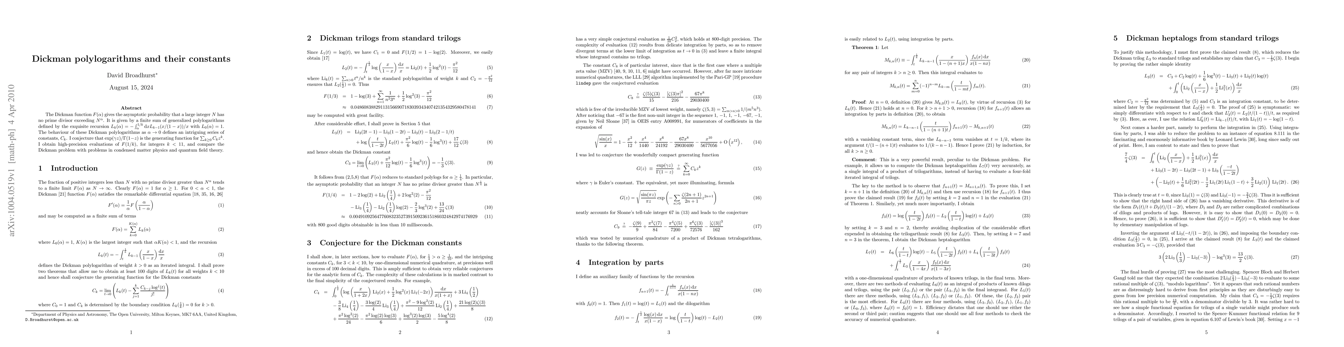 The Dickman function F(alpha) gives the asymptotic probability that a large integer N has no prime divisor exceeding N^alpha. It is given by a finite sum of generalized polylogarithms defined by the exquisite recursion L_k(alpha)=- int_alpha^{1/k} dx L_{k-1}(x/(1-x))/x with L_0(alpha)=1. The behaviour of these Dickman polylogarithms as alpha tends to 0 defines an intriguing series of constants, C_k. I conjecture that exp(gamma z)/Gamma(1-z) is the generating function for sum_{k\ge0} C_k z^k. I obtain high-precision evaluations of F(1/k), for integers k<11, and compare the Dickman problem with problems in condensed matter physics and quantum field theory.