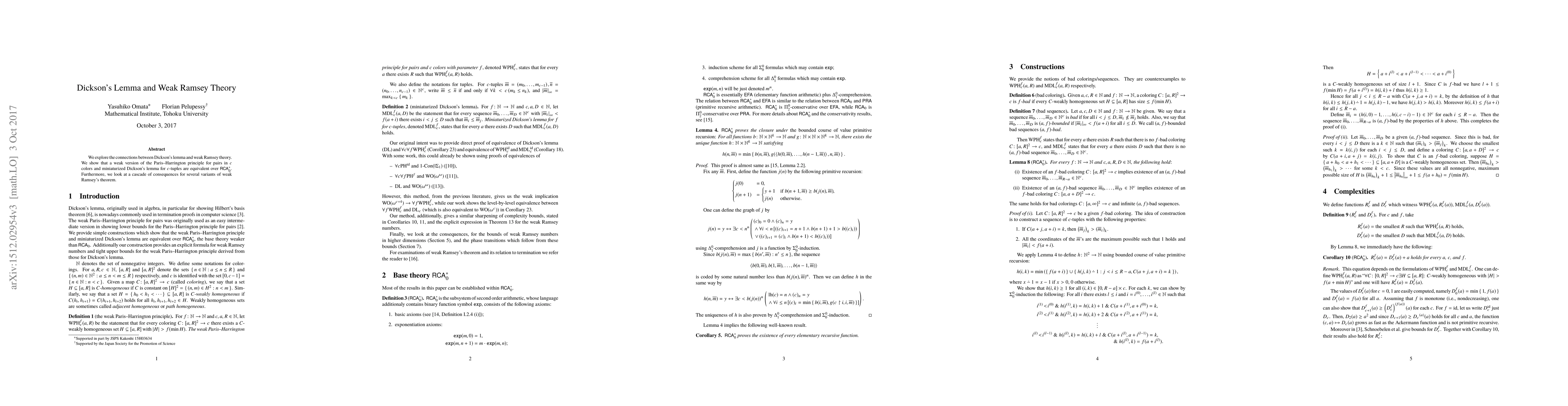 Summary: This paper investigates the equivalence between Dickson's lemma and weak Ramsey theory, demonstrating that a weak Paris-Harrington principle for pairs and a miniaturized Dickson's lemma for tuples are equivalent in $\mathsf{RCA}_0^{\ast}$, and explores implications for various weak Ramsey theorem variants.