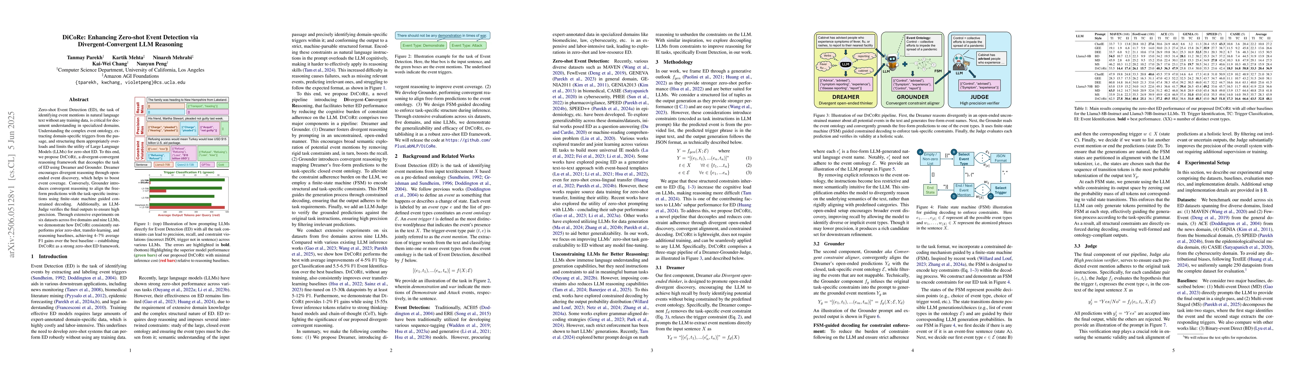 DiCoRe employs a divergent-convergent reasoning framework with Dreamer for open-ended event discovery, Grounder for constrained decoding guided by finite-state machines, and LLM-Judge for precision verification, applied to zero-shot Event Detection across six datasets and nine LLMs.