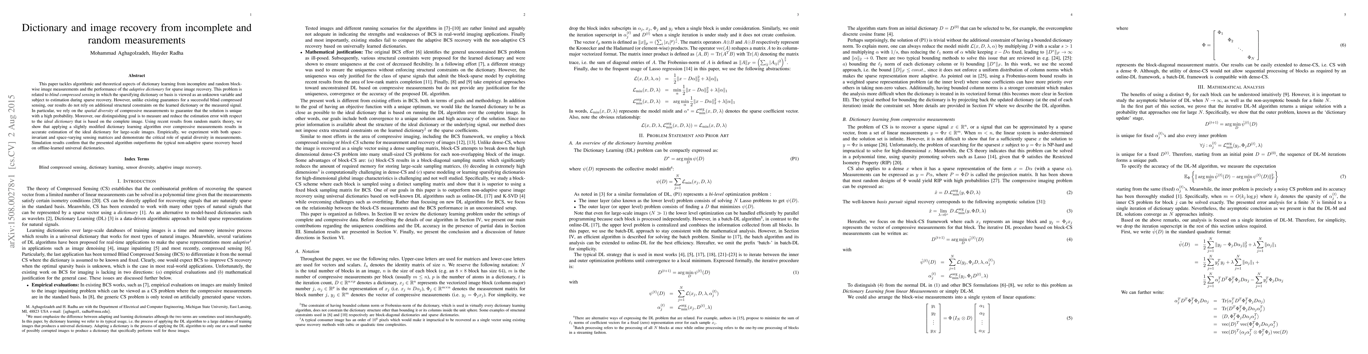 This paper develops a dictionary learning algorithm for sparse image recovery from incomplete, random block-wise measurements, achieving accurate estimation without additional structural constraints. The method leverages spatial diversity in measurements and outperforms traditional non-adaptive sparse recovery techniques.