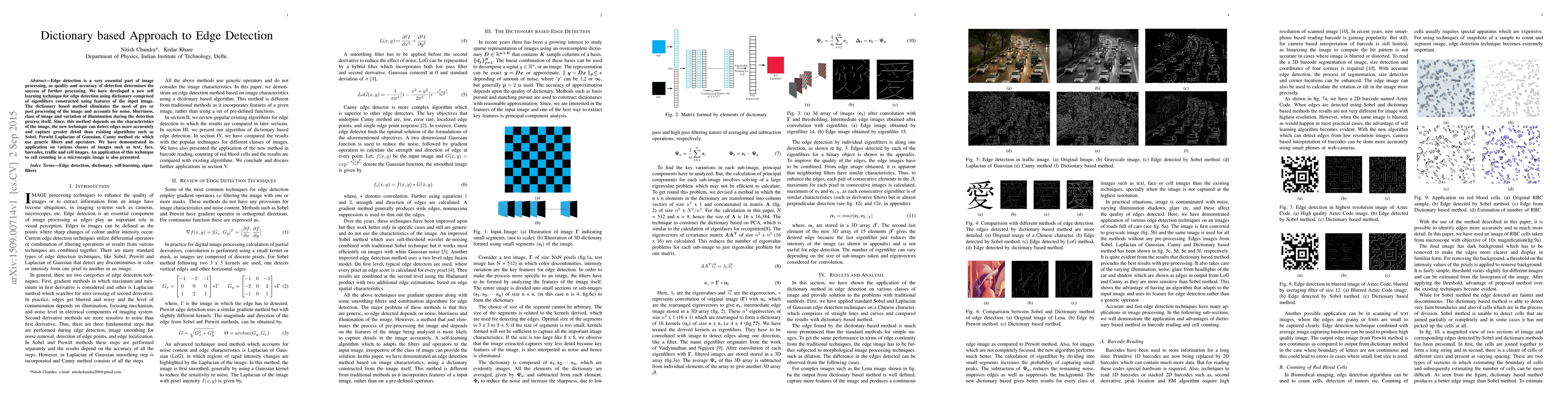 This research introduces a novel dictionary-based edge detection method that learns from image features, eliminating the need for pre or post-processing. It outperforms traditional methods like Sobel, Prewitt, Laplacian of Gaussian, and Canny in accuracy and detail capture, demonstrated on diverse image types including cells in microscopic images.