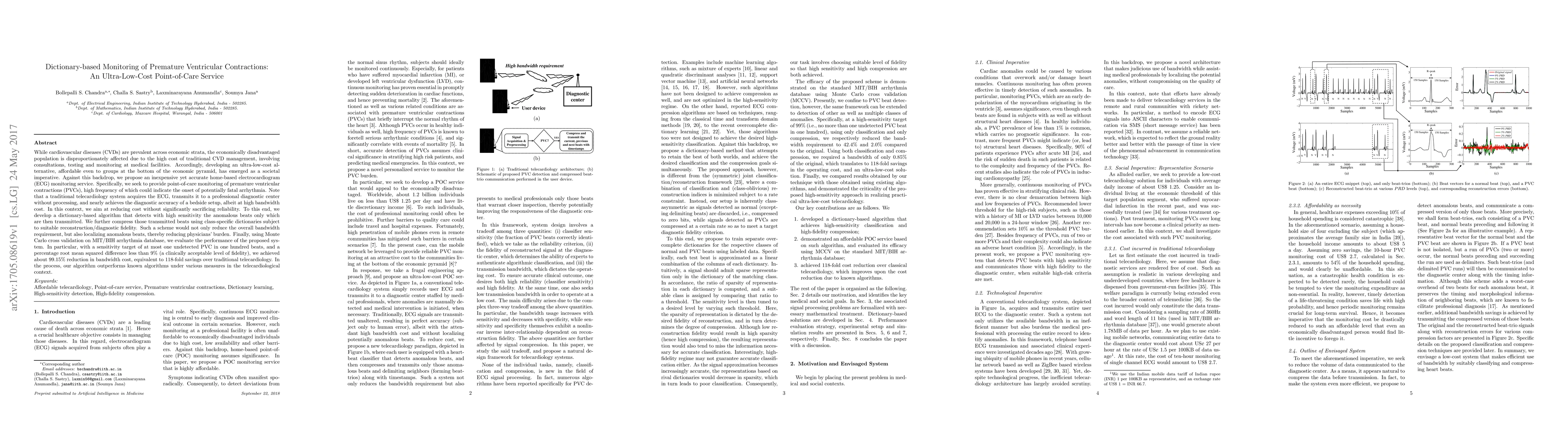 While cardiovascular diseases (CVDs) are prevalent across economic strata, the economically disadvantaged population is disproportionately affected due to the high cost of traditional CVD management. Accordingly, developing an ultra-low-cost alternative, affordable even to groups at the bottom of the economic pyramid, has emerged as a societal imperative. Against this backdrop, we propose an inexpensive yet accurate home-based electrocardiogram(ECG) monitoring service. Specifically, we seek to provide point-of-care monitoring of premature ventricular contractions (PVCs), high frequency of which could indicate the onset of potentially fatal arrhythmia. Note that a traditional telecardiology system acquires the ECG, transmits it to a professional diagnostic centre without processing, and nearly achieves the diagnostic accuracy of a bedside setup, albeit at high bandwidth cost. In this context, we aim at reducing cost without significantly sacrificing reliability. To this end, we develop a dictionary-based algorithm that detects with high sensitivity the anomalous beats only which are then transmitted. We further compress those transmitted beats using class-specific dictionaries subject to suitable reconstruction/diagnostic fidelity. Such a scheme would not only reduce the overall bandwidth requirement, but also localising anomalous beats, thereby reducing physicians' burden. Finally, using Monte Carlo cross validation on MIT/BIH arrhythmia database, we evaluate the performance of the proposed system. In particular, with a sensitivity target of at most one undetected PVC in one hundred beats, and a percentage root mean squared difference less than 9% (a clinically acceptable level of fidelity), we achieved about 99.15% reduction in bandwidth cost, equivalent to 118-fold savings over traditional telecardiology.