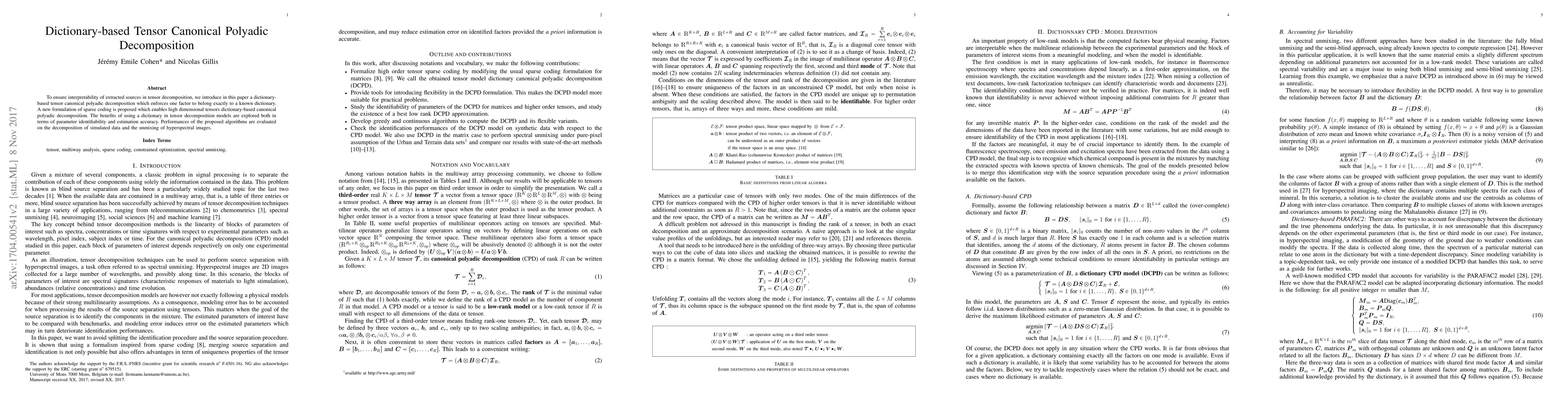 To ensure interpretability of extracted sources in tensor decomposition, we introduce in this paper a dictionary-based tensor canonical polyadic decomposition which enforces one factor to belong exactly to a known dictionary. A new formulation of sparse coding is proposed which enables high dimensional tensors dictionary-based canonical polyadic decomposition. The benefits of using a dictionary in tensor decomposition models are explored both in terms of parameter identifiability and estimation accuracy. Performances of the proposed algorithms are evaluated on the decomposition of simulated data and the unmixing of hyperspectral images.