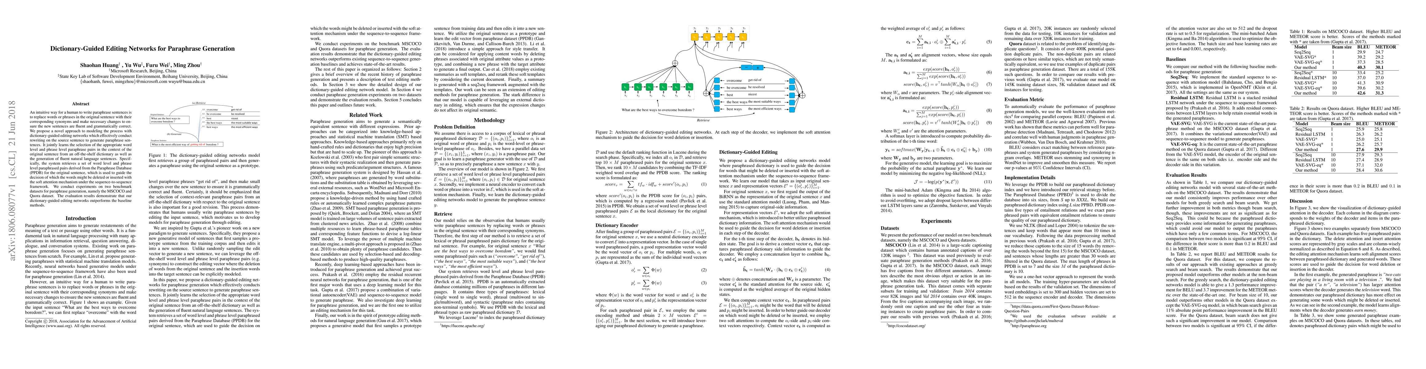 The paper proposes dictionary-guided editing networks for paraphrase generation, which leverage an off-the-shelf dictionary to identify synonym replacements and rewrite sentences while maintaining fluency. Experiments on MSCOCO and Quora datasets show superior performance compared to baseline methods.