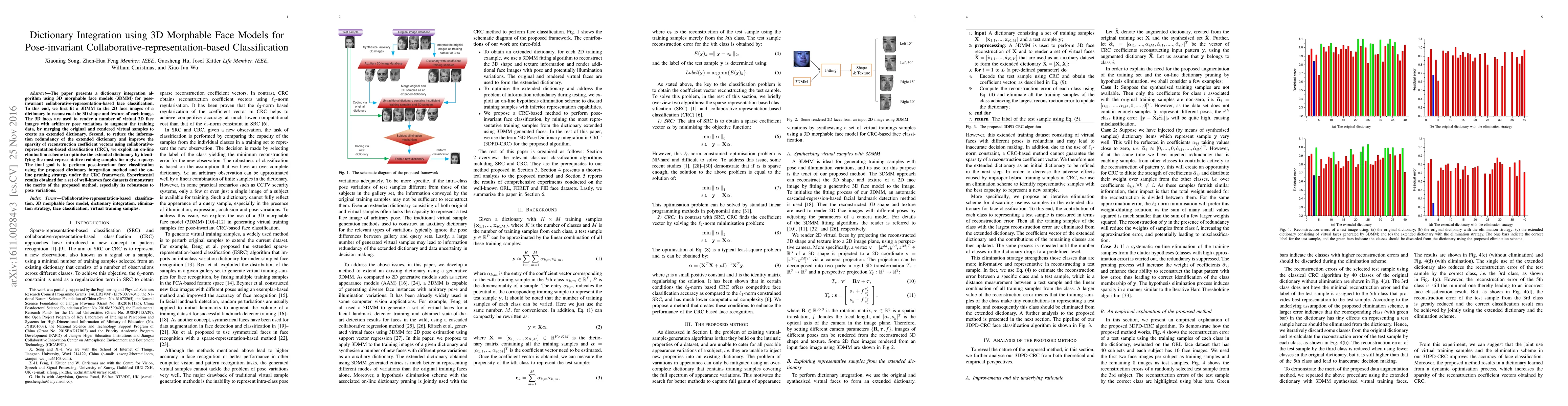The paper proposes a dictionary integration method using 3D morphable face models to augment training data for pose-invariant collaborative-representation-based face classification, achieving robustness to pose variations through an on-line elimination scheme. Experimental results show the method's effectiveness in handling pose variations across datasets.