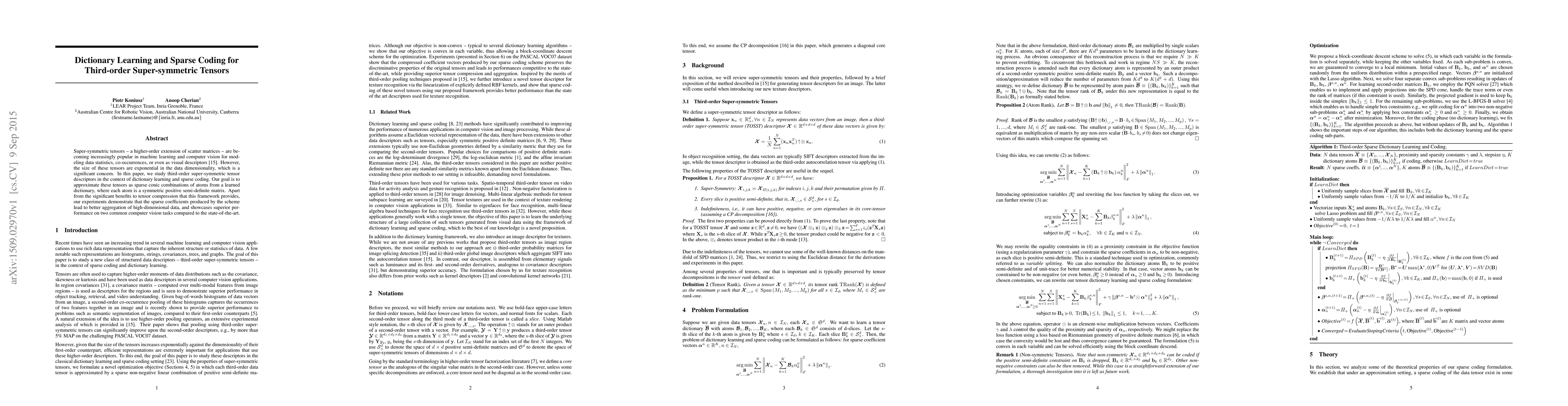 This paper explores dictionary learning and sparse coding for third-order super-symmetric tensors, aiming to compress these tensors and improve data aggregation. The proposed method approximates tensors using sparse combinations of learned dictionary atoms, demonstrating superior performance in computer vision tasks compared to existing methods.