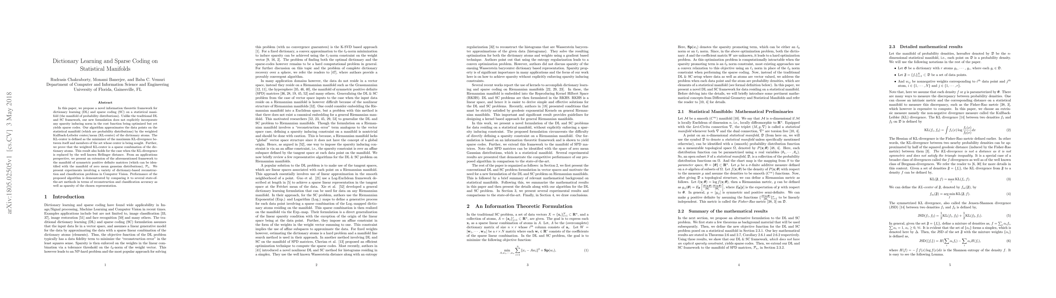 This paper introduces a novel information theoretic framework for dictionary learning and sparse coding on statistical manifolds, achieving sparse codes without explicit sparsity norms. The method approximates data points by the weighted Kullback-Leibler center of dictionary atoms, demonstrating its effectiveness in computer vision applications.