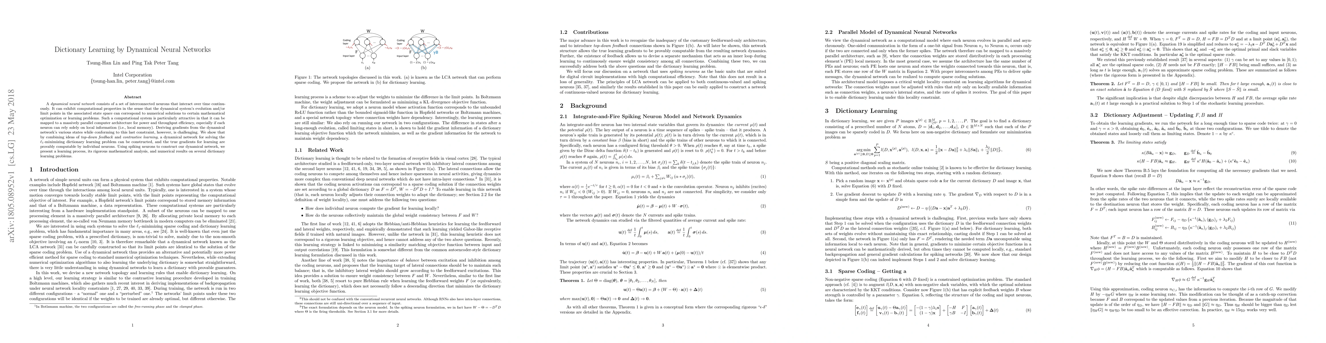 A dynamical neural network consists of a set of interconnected neurons that interact over time continuously. It can exhibit computational properties in the sense that the dynamical system's evolution and/or limit points in the associated state space can correspond to numerical solutions to certain mathematical optimization or learning problems. Such a computational system is particularly attractive in that it can be mapped to a massively parallel computer architecture for power and throughput efficiency, especially if each neuron can rely solely on local information (i.e., local memory). Deriving gradients from the dynamical network's various states while conforming to this last constraint, however, is challenging. We show that by combining ideas of top-down feedback and contrastive learning, a dynamical network for solving the l1-minimizing dictionary learning problem can be constructed, and the true gradients for learning are provably computable by individual neurons. Using spiking neurons to construct our dynamical network, we present a learning process, its rigorous mathematical analysis, and numerical results on several dictionary learning problems.