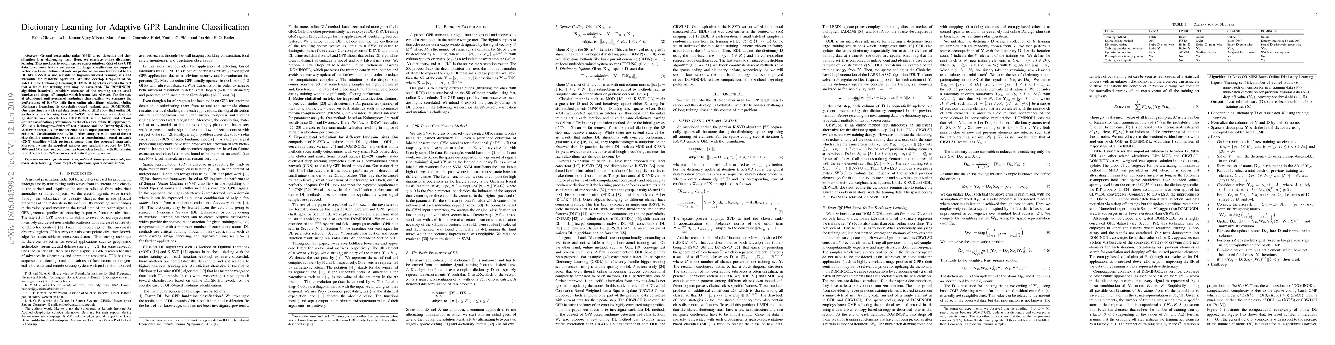 This research explores the use of online dictionary learning methods for adaptive classification of landmines using ground penetrating radar (GPR) data. The study introduces DOMINODL, a novel online dictionary learning algorithm that enhances feature extraction and classification efficiency, significantly reducing learning time and improving detection rates compared to traditional batch methods like K-SVD. The results demonstrate the robustness and effectiveness of the proposed approach over convolutional neural networks, especially under reduced sample conditions.