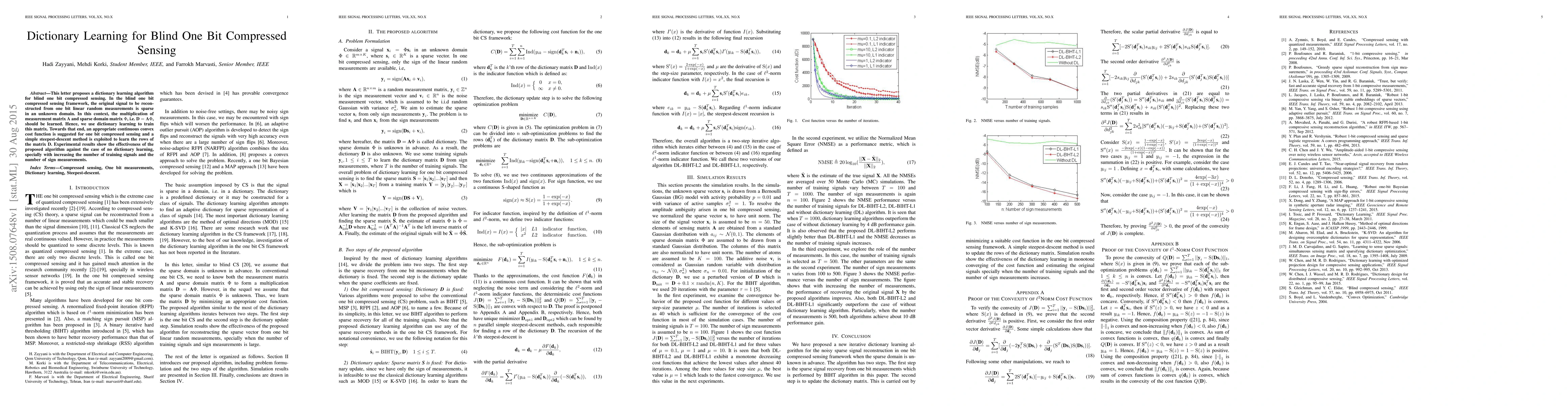 This paper proposes a dictionary learning algorithm for blind one bit compressed sensing, where the goal is to reconstruct a sparse signal from one bit measurements. The method learns the multiplication matrix through a continuous convex cost function and a steepest-descent approach, demonstrating improved performance with more training signals and measurements.