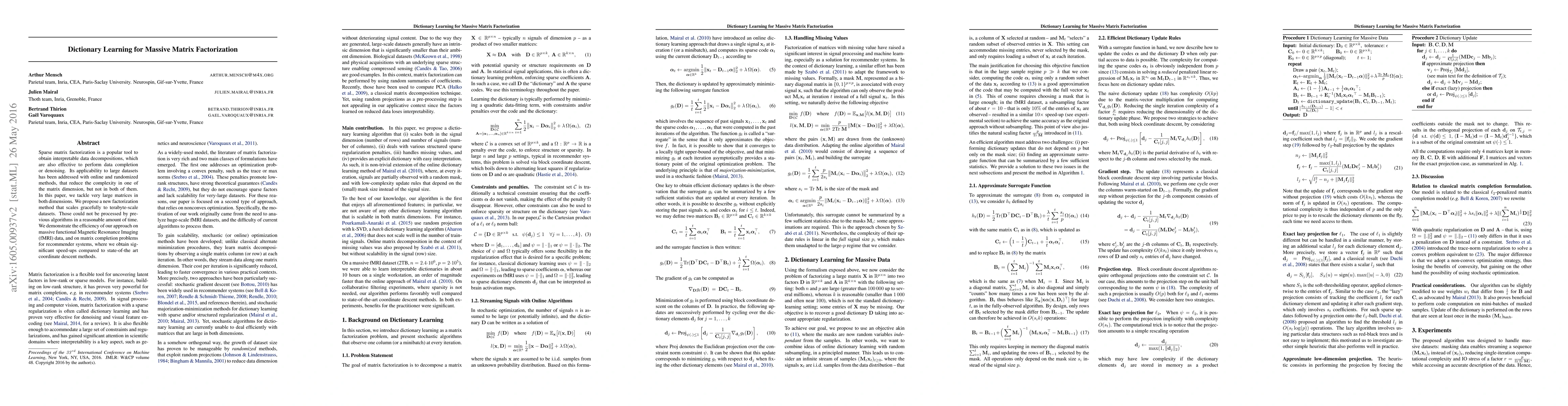 Sparse matrix factorization is a popular tool to obtain interpretable data decompositions, which are also effective to perform data completion or denoising. Its applicability to large datasets has been addressed with online and randomized methods, that reduce the complexity in one of the matrix dimension, but not in both of them. In this paper, we tackle very large matrices in both dimensions. We propose a new factoriza-tion method that scales gracefully to terabyte-scale datasets, that could not be processed by previous algorithms in a reasonable amount of time. We demonstrate the efficiency of our approach on massive functional Magnetic Resonance Imaging (fMRI) data, and on matrix completion problems for recommender systems, where we obtain significant speed-ups compared to state-of-the art coordinate descent methods.