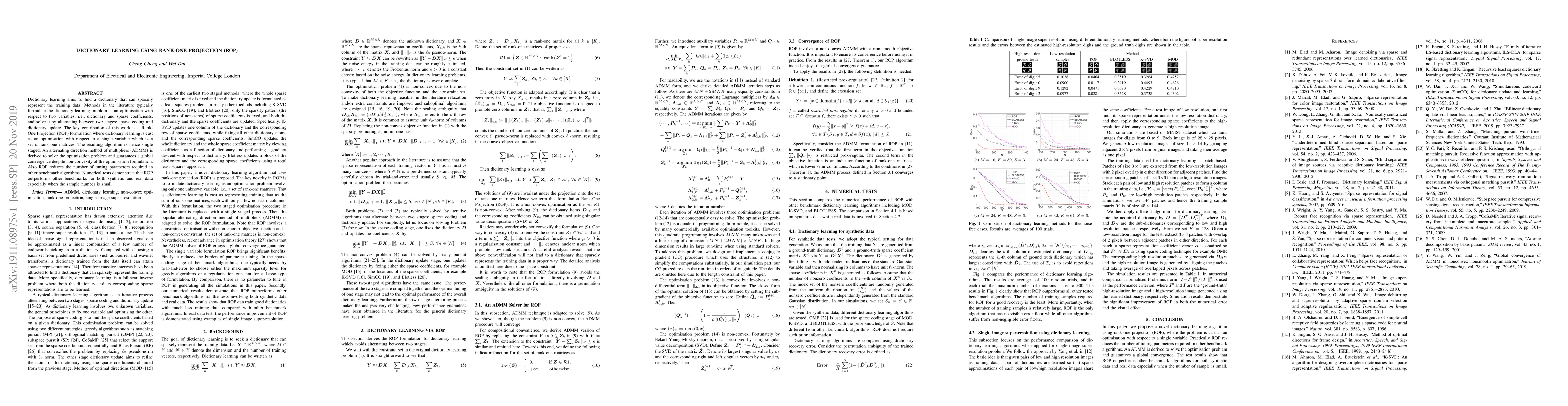 This paper proposes a Rank-One Projection (ROP) formulation for dictionary learning, optimizing a single variable of rank-one matrices instead of two, leading to a single-stage algorithm. The method uses an ADMM approach to ensure global convergence and reduces tuning parameters, outperforming other benchmarks in numerical tests.