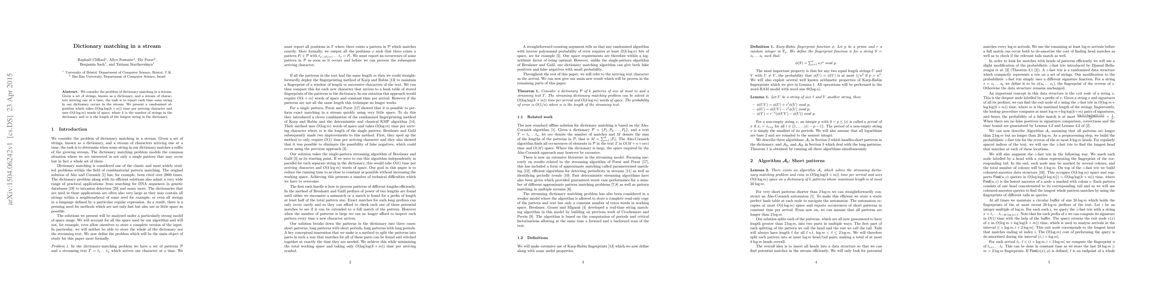 This paper presents a randomized algorithm for dictionary matching in a data stream, achieving O(log log(k + m)) time per character and O(k log m) space, where k is the number of dictionary strings and m is the length of the longest string. The algorithm efficiently reports occurrences of dictionary strings as they appear in the stream.
