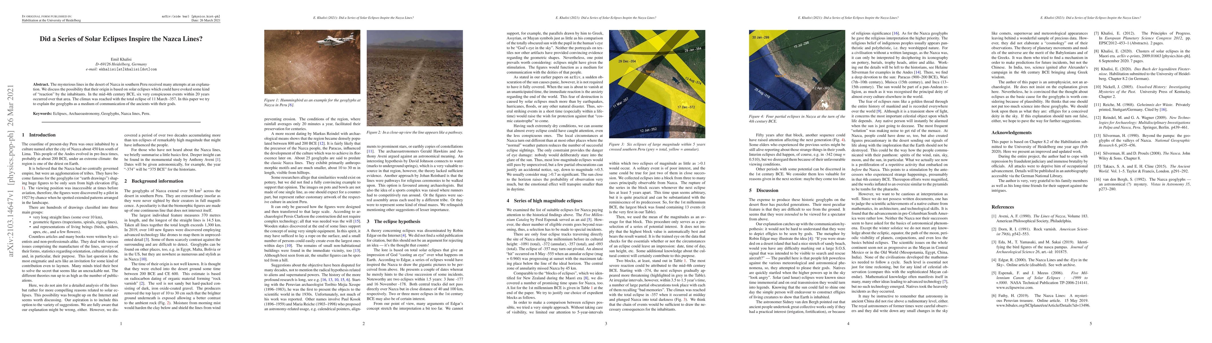 The mysterious lines in the desert of Nazca in southern Peru received many attempts at an explanation. We discuss the possibility that their origin is based on solar eclipses which could have evoked some kind of "reaction" by the inhabitants. In the mid-4th century BCE, six very conspicuous events within 20 years occurred over that area. The climax was reached with the total eclipse of 11 March -357. In this paper we try to explain the geoglyphs as a medium of communication of the ancients with their gods.