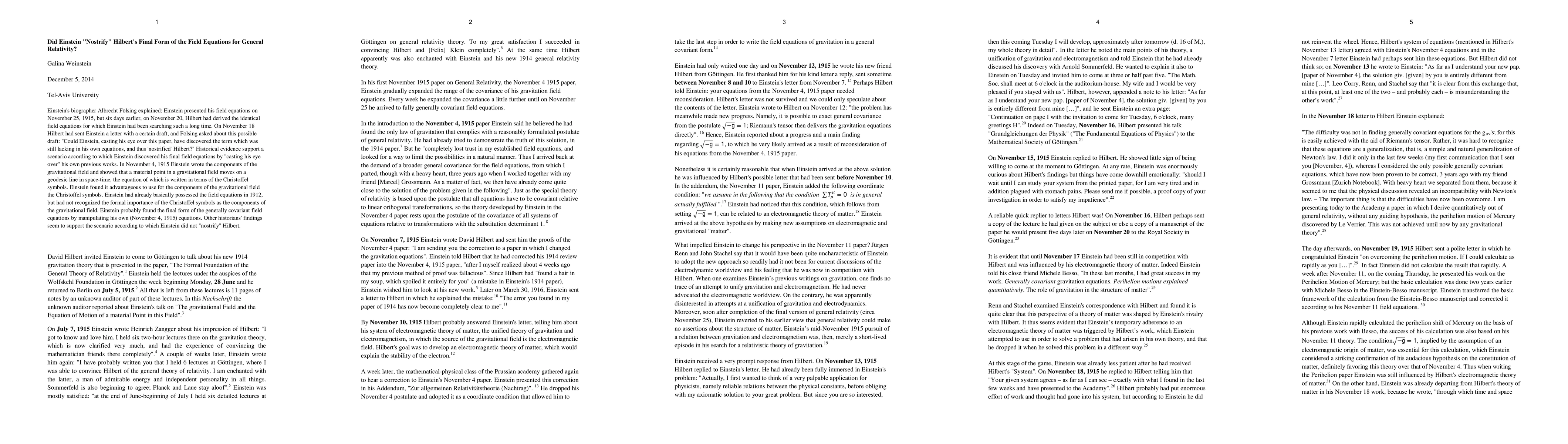 Einstein's biographer Albrecht F\"olsing explained: Einstein presented his field equations on November 25, 1915, but six days earlier, on November 20, Hilbert had derived the identical field equations for which Einstein had been searching such a long time. On November 18 Hilbert had sent Einstein a letter with a certain draft, and F\"olsing asked about this possible draft: "Could Einstein, casting his eye over this paper, have discovered the term which was still lacking in his own equations, and thus 'nostrified' Hilbert?" Historical evidence support a scenario according to which Einstein discovered his final field equations by "casting his eye over" his own previous works. In November 4, 1915 Einstein wrote the components of the gravitational field and showed that a material point in a gravitational field moves on a geodesic line in space-time, the equation of which is written in terms of the Christoffel symbols. Einstein found it advantageous to use for the components of the gravitational field the Christoffel symbols. Einstein had already basically possessed the field equations in 1912, but had not recognized the formal importance of the Christoffel symbols as the components of the gravitational field. Einstein probably found the final form of the generally covariant field equations by manipulating his own (November 4, 1915) equations. Other historians' findings seem to support the scenario according to which Einstein did not "nostrify" Hilbert.
