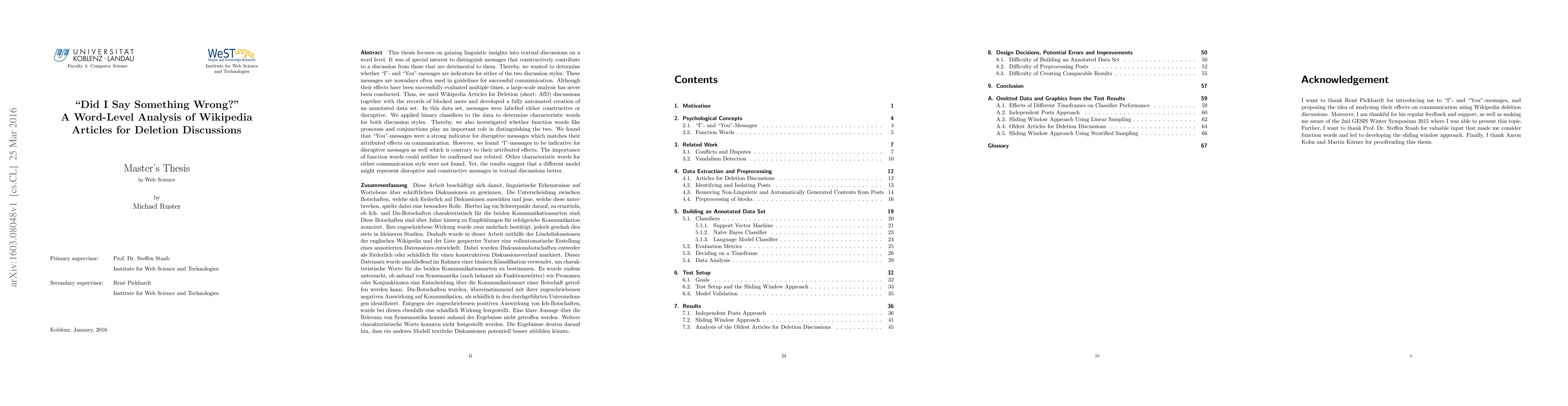 This thesis focuses on gaining linguistic insights into textual discussions on a word level. It was of special interest to distinguish messages that constructively contribute to a discussion from those that are detrimental to them. Thereby, we wanted to determine whether "I"- and "You"-messages are indicators for either of the two discussion styles. These messages are nowadays often used in guidelines for successful communication. Although their effects have been successfully evaluated multiple times, a large-scale analysis has never been conducted. Thus, we used Wikipedia Articles for Deletion (short: AfD) discussions together with the records of blocked users and developed a fully automated creation of an annotated data set. In this data set, messages were labelled either constructive or disruptive. We applied binary classifiers to the data to determine characteristic words for both discussion styles. Thereby, we also investigated whether function words like pronouns and conjunctions play an important role in distinguishing the two. We found that "You"-messages were a strong indicator for disruptive messages which matches their attributed effects on communication. However, we found "I"-messages to be indicative for disruptive messages as well which is contrary to their attributed effects. The importance of function words could neither be confirmed nor refuted. Other characteristic words for either communication style were not found. Yet, the results suggest that a different model might represent disruptive and constructive messages in textual discussions better.