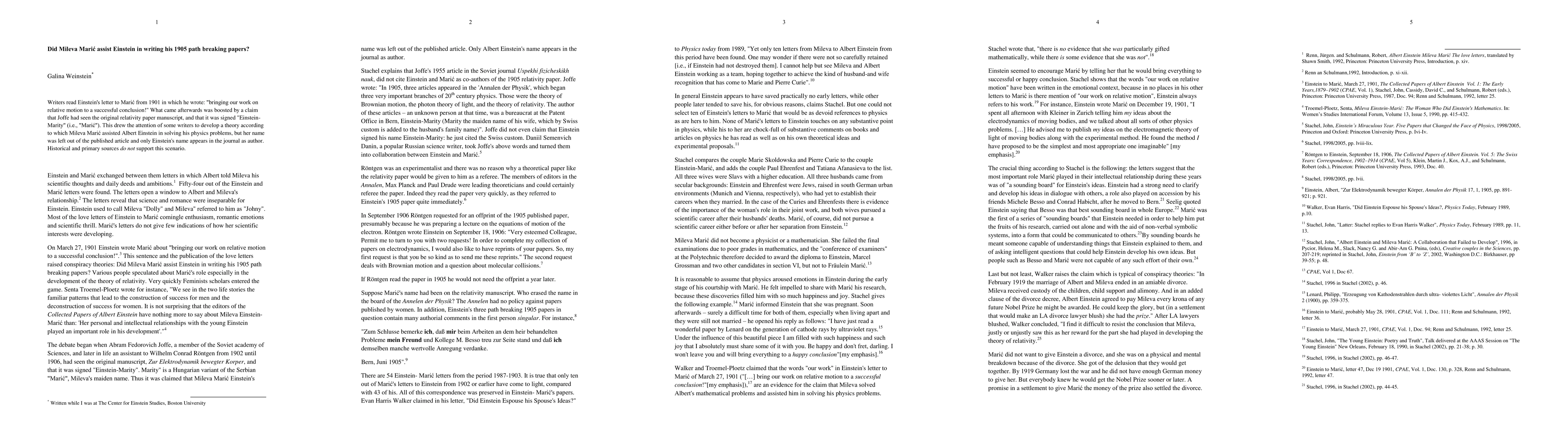 Writers read Einstein's letter to Mari\'c from 1901 in which he wrote: "bringing our work on relative motion to a successful conclusion!" What came afterwards was boosted by a claim that Joffe had seen the original relativity paper manuscript, and that it was signed "Einstein-Marity" (i.e., "Mari\'c"). This drew the attention of some writers to develop a theory according to which Mileva Mari\'c assisted Albert Einstein in solving his physics problems, but her name was left out of the published article and only Einstein's name appears in the journal as author. Historical and primary sources do not support this scenario.