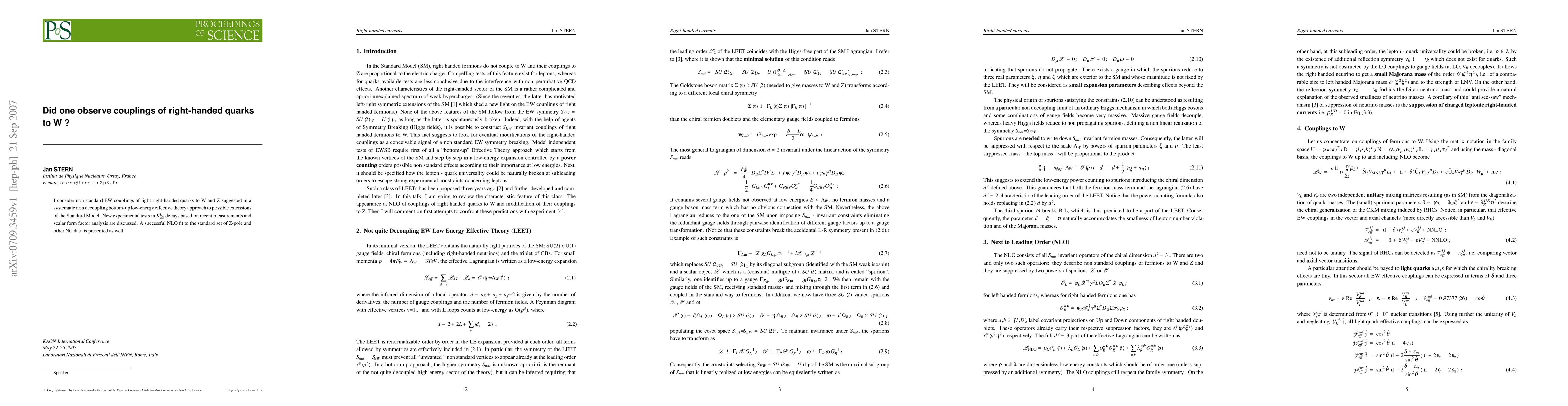 I consider non standard EW couplings of light right-handed quarks to W and Z suggested in a systematic non decoupling bottom-up low-energy effective theory approach to possible extensions of the Standard Model. New experimental tests in K^L_{mu3} decays based on recent measurements and scalar form factor analysis are discussed. A successful NLO fit to the standard set of Z-pole and other NC data is presented as well.
