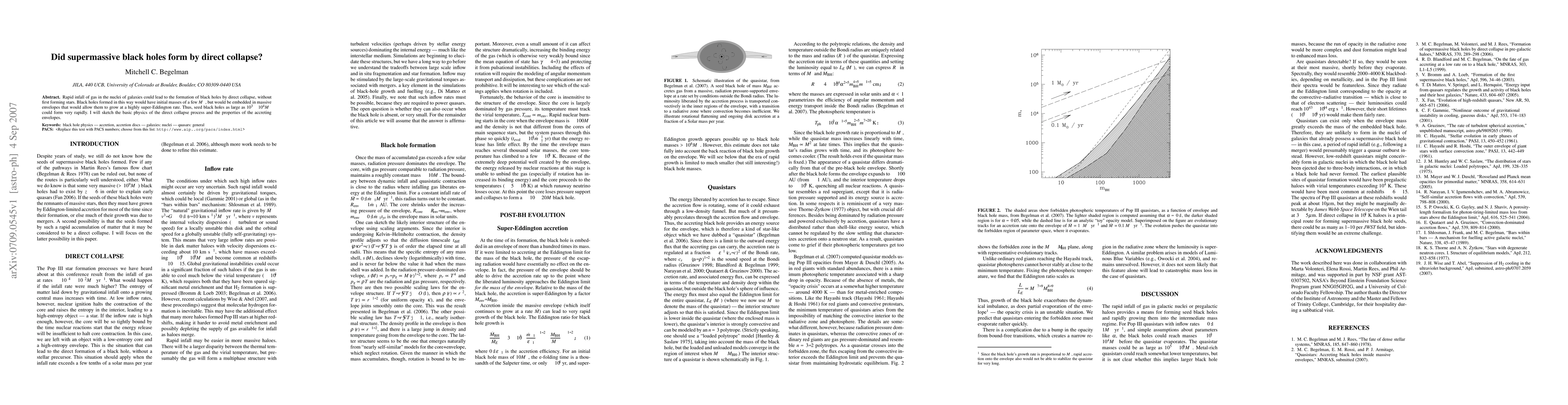 This paper explores the possibility that supermassive black holes could form through direct collapse of gas in galactic nuclei, bypassing star formation. Such black holes would initially be small but could rapidly grow to massive sizes by accreting material at super-Eddington rates.