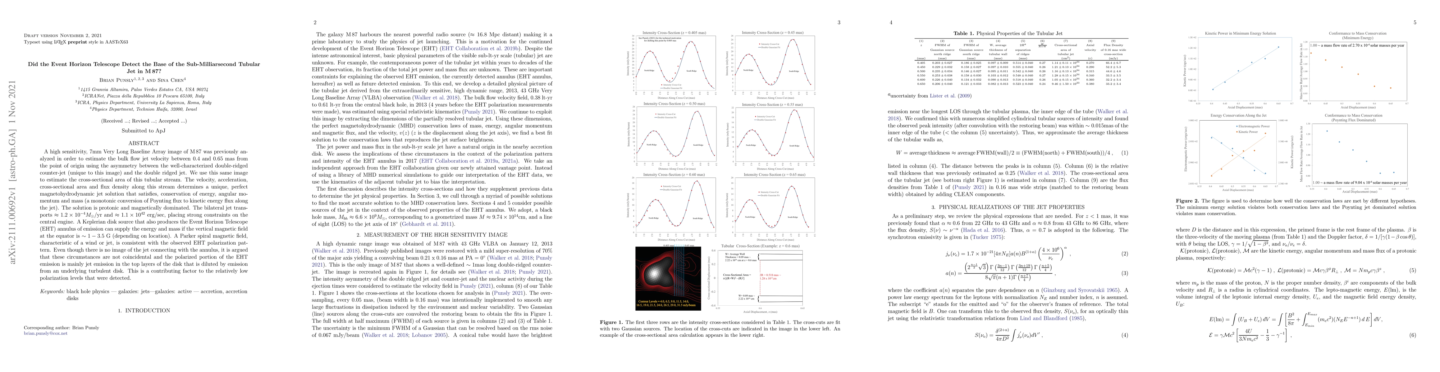 Researchers used EHT data to estimate a sub-milliarsecond tubular jet's velocity, acceleration, and cross-sectional area in M87, finding it transports massive amounts of energy and mass from a central engine.