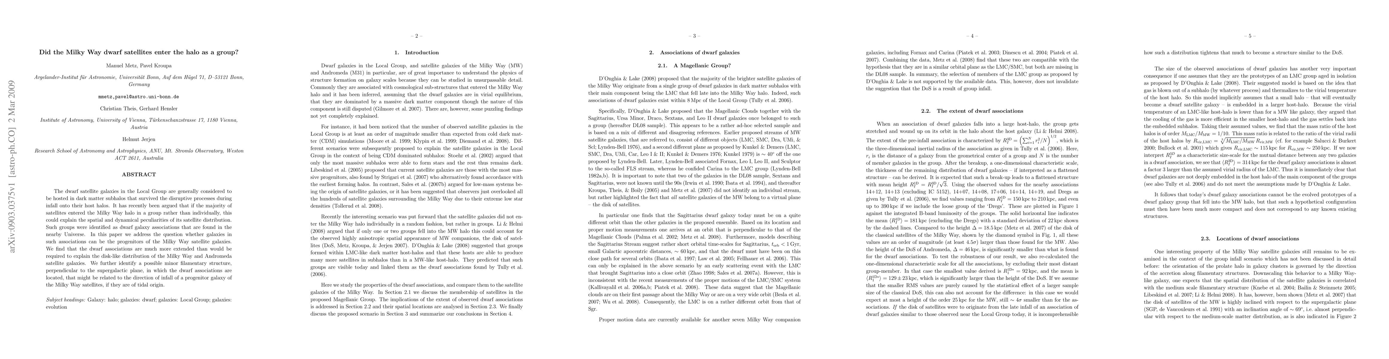 This paper investigates whether the Milky Way's dwarf satellite galaxies entered the galactic halo as a group, finding that the spatial extent of nearby dwarf associations is too large to account for the observed distribution of Milky Way satellites. A minor filamentary structure perpendicular to the supergalactic plane may suggest a possible tidal origin for the satellite galaxies.