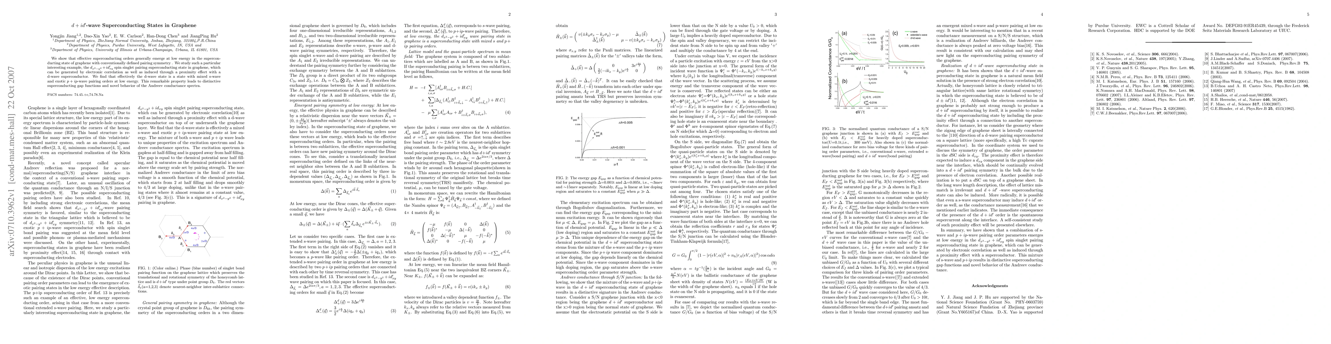 This paper explores the emergence of effective superconducting orders in graphene, specifically focusing on the $d_{x^2-y^2}+id'_{xy}$ spin singlet pairing state. It reveals that this state exhibits mixed s-wave and exotic $p+ip$-wave pairing, leading to unique superconducting gap functions and novel Andreev conductance spectra.