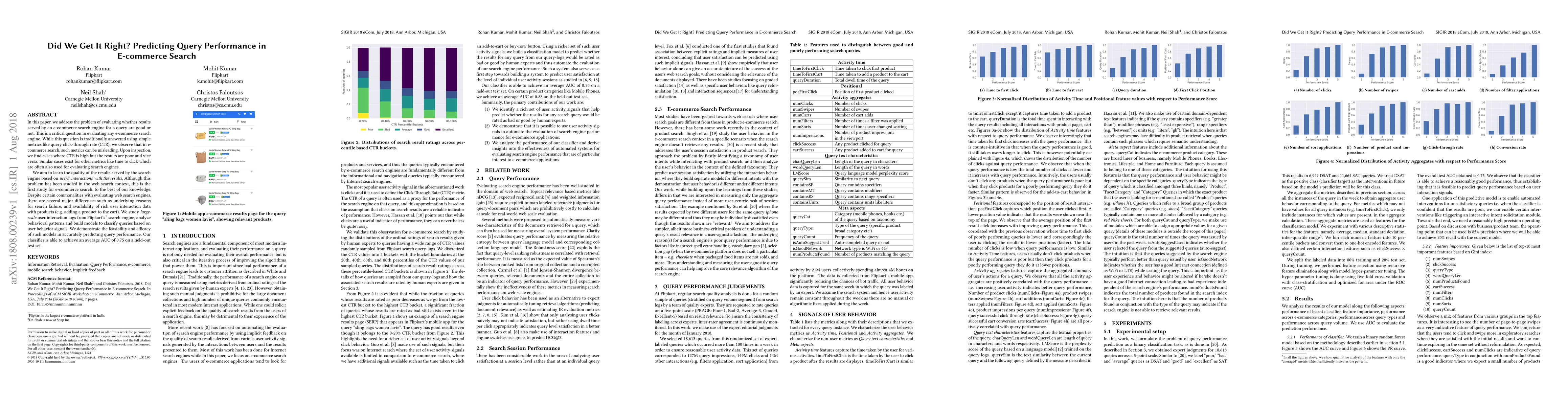 This paper investigates the challenge of accurately assessing the performance of e-commerce search results, finding that traditional metrics like click-through rate are often misleading. The authors develop models based on user interaction data to better predict query performance, achieving an average AUC of 0.75, demonstrating the potential of behavioral signals in evaluating search quality.