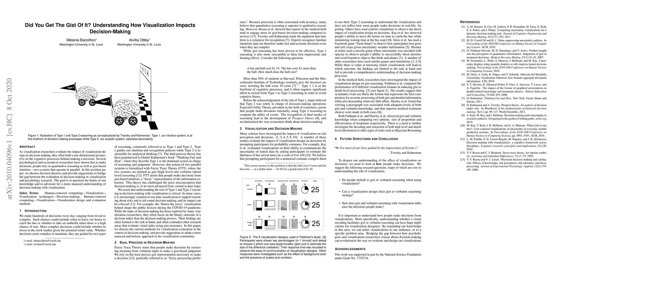This paper explores how visualization impacts decision-making by considering both quantitative reasoning and gist-based intuition, advocating for a more nuanced understanding that bridges visualization design and psychological research. It aims to challenge current one-dimensional evaluations and promote a comprehensive approach to decision-making in visualization.